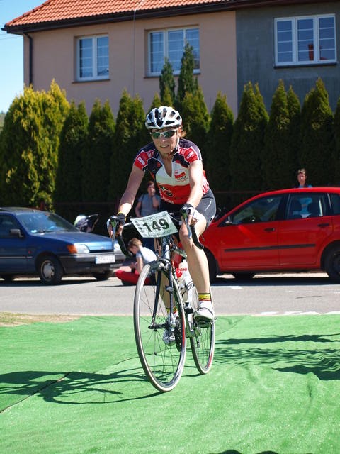 Wreszcie jest ostatni długi zjazd i już tabliczka Trzebnica. W mieście skręt w lewo, na którym policjanci zatrzymują ruch samochodów, rondo, przejazd w tunelu i meta. Na mecie czekał już na mnie Darek. Próbuję zejść z roweru, ale w tym momencie łapią mnie skurcze w mięśniach uda: z przodu i z tyłu. Nieciekawa sytuacja, bo nie wiadomo jak to rozciągnąć. Podczas jazdy już w końcówce też łapały mnie skurcze, ale wtedy próbowałam je rozciągać (na zjazdach), albo kręcić z dużą kadencją aby ich tak bardzo nie napinać. Te skurcze to wynik odwodnienia. Nie zatrzymywałam się na pierwszym punkcie żywieniowym, bo mieliśmy jeszcze wtedy dużo picia, na drugim postój był krótki, przelałam wodę do bidonu i jazda. Nawet nic nie zjadłam, miałam swoje batoniki i żele węglowodanowe, które wciągałam przed każdą większą górką. Potem już nic do picia nie było, a moja woda i resztka napoju szybko się skończyła. Widziałam po drodze sklep i nawet stał oparty przed sklepem rower z numerem startowym, ale nie wzięłam ze sobą pieniędzy, więc pojechałam dalej. Kolejne doświadczenia startowe za mną.