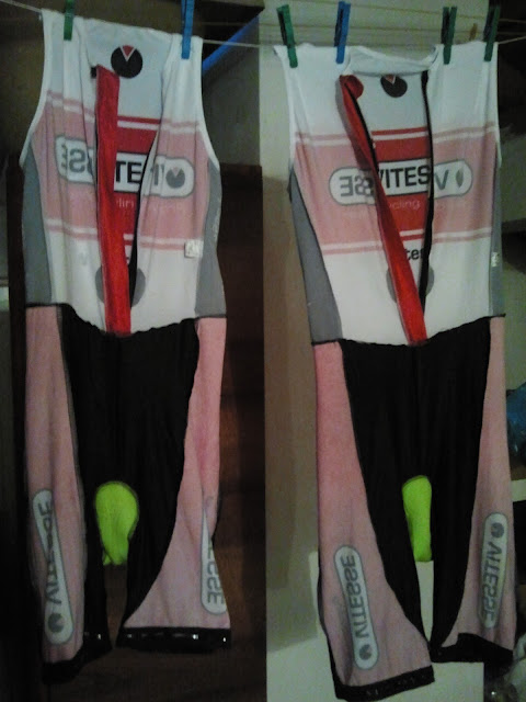 Teraz o newralgicznych punktach: kontakt z siodłem jest izolowany przez minimalistyczną wkładkę typową dla strojów triathlonowych. Okazuje się, że po przejechaniu z górą 130 km na szosie wkładka grubości firanki wystarcza i nie jest potrzebna żadna pielucha, którą stosuje się w spodenkach rowerowych.