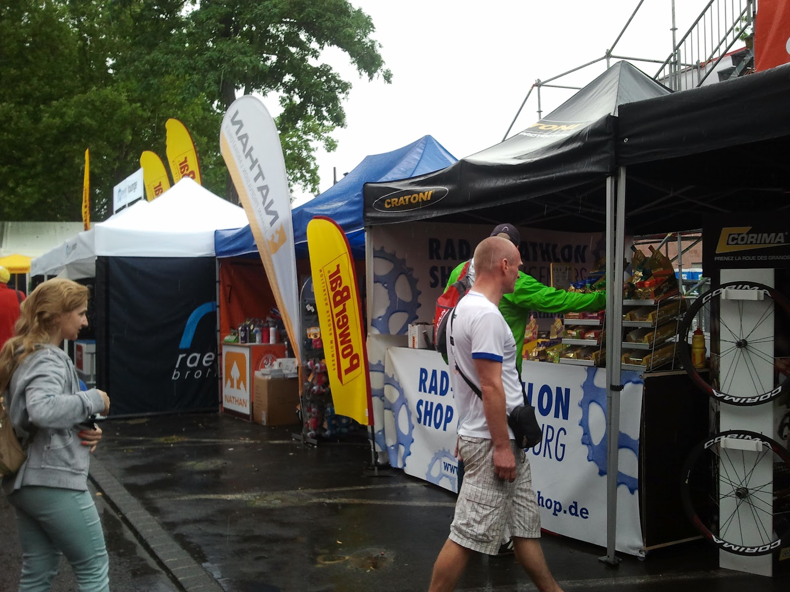 Innych atrakcji na trasie rowerowej też nie brakuje: jest fragment po kocich łbach i po kostce, podjazd na którym stoi szpaler kibiców i jest tak wąsko, że może zmieścić się tylko jeden rower. Ten odcinek akurat jechałam za dwoma Meksykankami, które wlokły się okrutnie, ale przynajmniej tu odpoczęłam jadąc wolno za nimi. Na podjeździe po kostce wyprzedziłam chłopaka na cervello, ale trudno nie dostać skrzydeł jak się słyszy jak gość wrzeszczy przez mikrofon: „Frau Renata. Polen”. Taki doping jednak działa niesamowicie. Deszcz przestał mi zupełnie przeszkadzać.