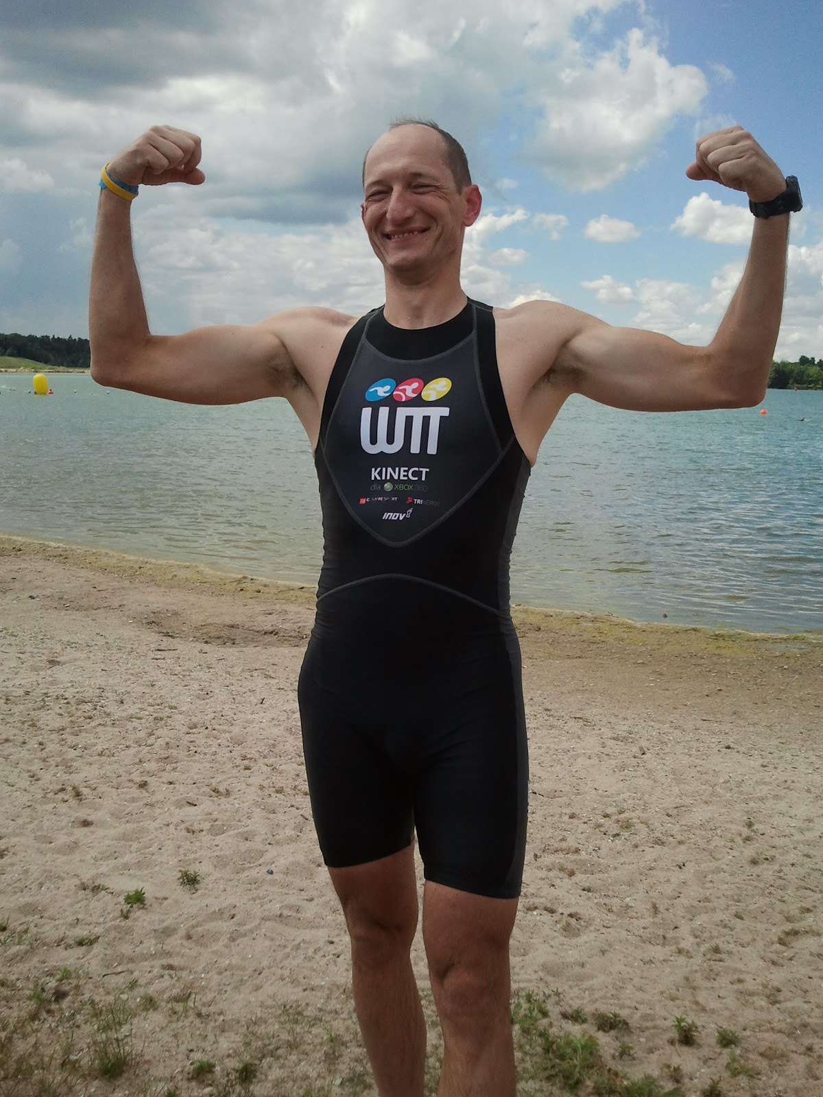 Wchodzimy do wody, Darek przepływa kilka metrów żwawiej w ramach rozgrzewki. Widoczność w przyciemnianych okularkach nie jest największa, bo jest pochmurno. Kilkanaście razy przepłukuję okularki żeby przestały parować. Stoimy w wodzie do pasa, blisko brzegu, nie pchając się za bardzo do linii startu w wodzie. Zostało 5 sekund więc ostatni buziak dla Darka i płyniemy. Najpierw ostrożnie, ale potem jest coraz ciaśniej bo doganiam tych, którzy płyną podobnym tempem. I tak było do samego końca. Ktoś płynie z prawej, ktoś z lewej i nie da się ominąć tego z przodu. Najciaśniej oczywiście przy bojach, a szczytem ciasnoty był nawrót przy platformie gdzie płynęliśmy wąskim korytarzem ściśnięci jak śledzie w beczce. Myślałam, że jak wypłyniemy z tego kanału, to dalej będzie lepiej, ale gdzie tam, ciągle ktoś mnie łapał za nogę, wpadał bokiem, kopał nogą, uderzał ręką. Wszelkie próby uwolnienia się zdawały się na nic. Otaczała mnie wielka masa wijących się w wodzie czarnych pianek dążących w kierunku żółtej boi (skojarzenie nasuwa się samo). Po 44 minutach wychodzę na brzeg, łapię chwilę oddechu i znów do wody.