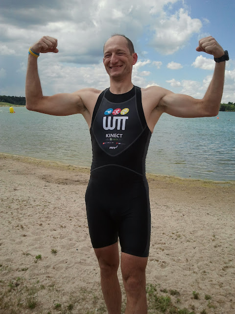 Korzystając z tego, że mamy bardzo dużo czasu, jest ciepło i słonecznie, pływamy zgodnie z naszym planem około 30 minut w jeziorze. Woda ma 24 stopnie, można pływać bez pianek. Widać już część boi rozstawionych na jeziorze.