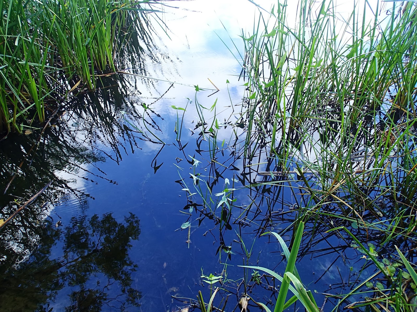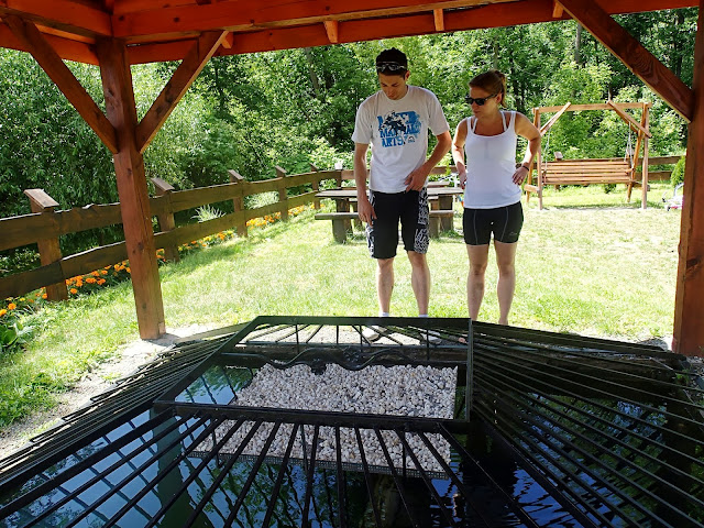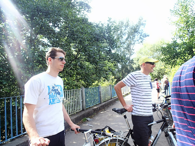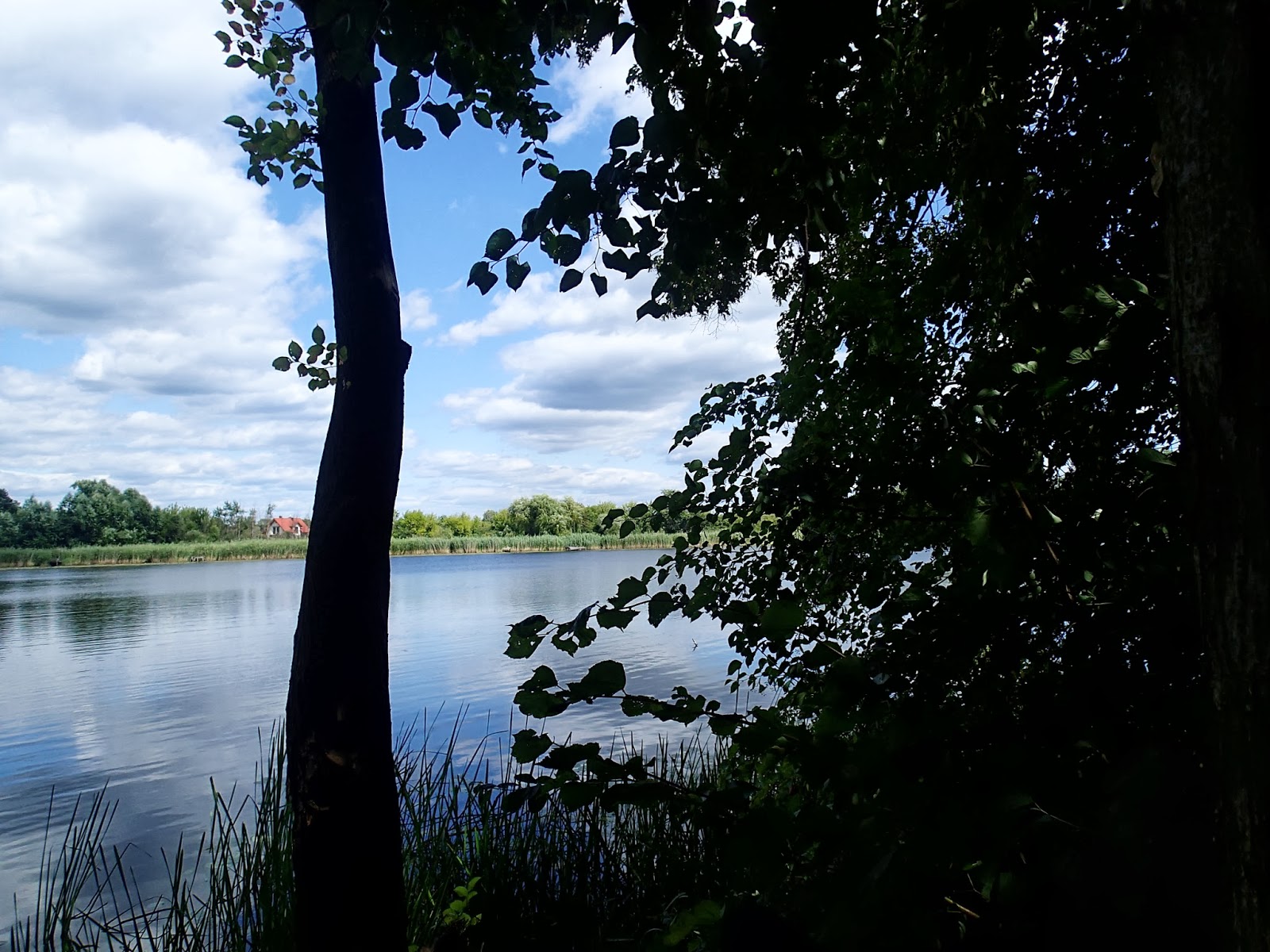 Po przedarciu się przez „50-tkę” jesteśmy w spokojniejszej części globu gdzie można jechać na rowerach obok siebie i rozmawiać bez konieczności przekrzykiwania szumu aut. Wokół pola z warzywami i sady owocowe. Bardzo miły fragment trasy. Dodatkowo na chwilę zatrzymujemy sie nad jeziorkiem.