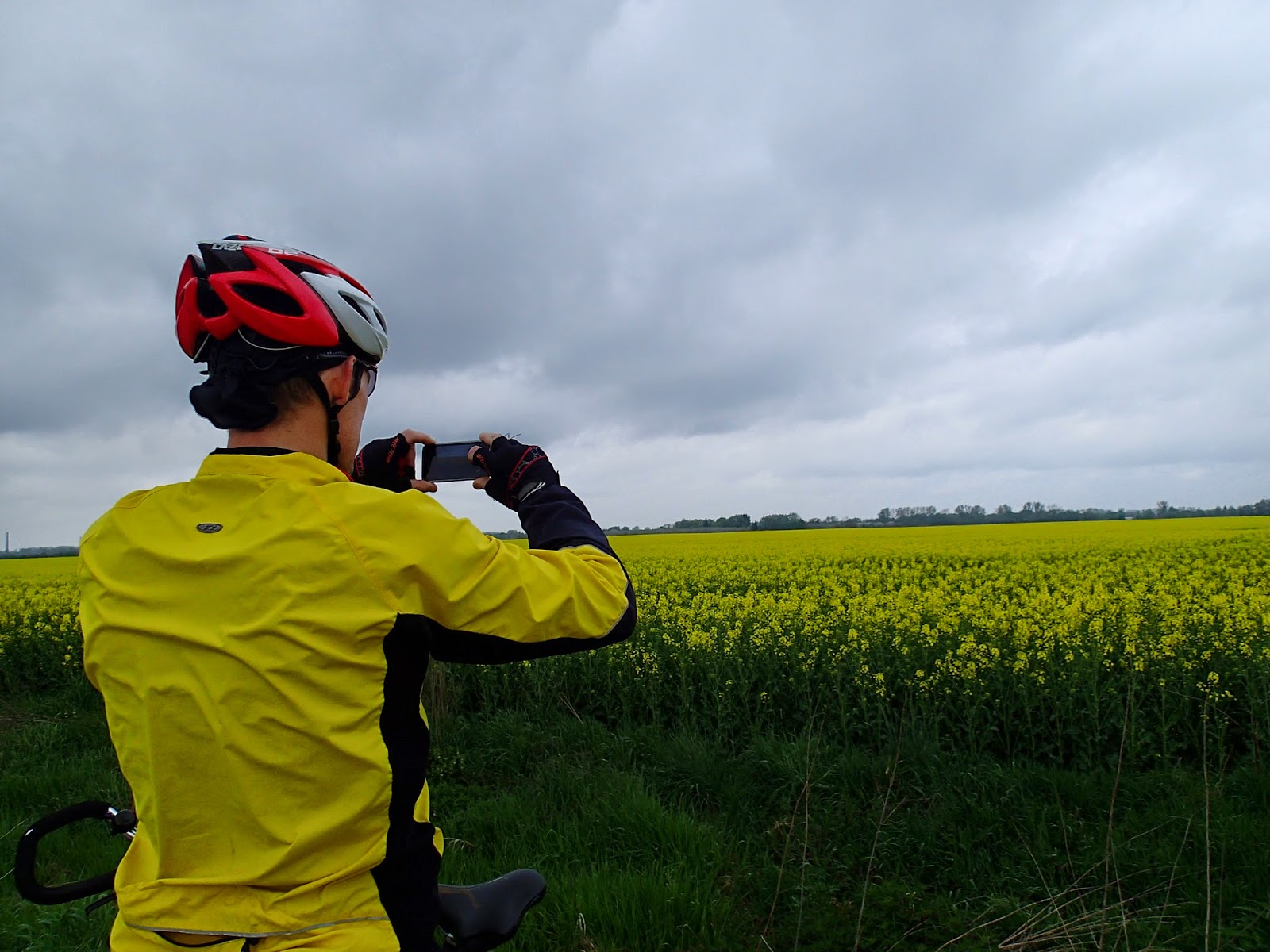 Niebo zaczęło się lekko przejaśniać, ale nadal straszyło wiszącymi sinymi chmurami, dobrze że byliśmy już w drodze powrotnej. Przed Habdzinem mijamy sporo kolarzy, ale oni raczej nie zwracają uwagi na mazowiecki krajobraz, bo mają wszyscy okulary przeciwsłoneczne i aerodynamiczną pozycję, która raczej służy zerkaniu na licznik mierzący kadencję i średnią prędkość, niż zadzieraniu głowy żeby zobaczyć coś więcej niż kawałek asfaltu przed przednim kołem. Znamy to z autopsji dlatego dziś zachwycamy się otaczającymi widokami.