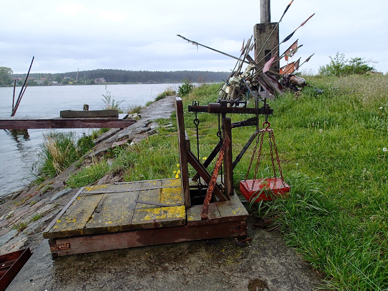 Pierwsza przerwa w opadach była na przeprawie promowej. Gdy dojechaliśmy do brzegu było pusto, wszystko zamknięte na głucho, żadnej informacji o której prom przypływa. Przy promie po drugiej stronie też nie widać żadnego ruchu. Zrezygnowani odjeżdżamy i wtedy Darek pyta idącą w stronę przeprawy kobietę. Ta odpowiada, że prom jest czynny i że odpływa z drugiego brzegu o pełnej godzinie i w pół godziny po pełnej godzinie. Jest za 5 minut czwarta, więc prom powinien niedługo być po naszej stronie i rzeczywiście płynie. Na nabrzeżu czeka jeden samochód, my dwoje z rowerami. Z promu zjeżdża też tylko jeden samochód. Ruchu tu nie ma za dużego, ale czy to jest powód dla którego nie należałoby na tablicy podać informacji jakie są godziny kursowania promu? Zirytowała mnie ta sytuacja na tyle, że usiłowałam wytłumaczyć obsłudze promu, że oprócz cennika powinna być także podana godzina odpływania promu. Na to otrzymałam odpowiedź, że przecież taka informacja jest… na tablicy na drugim brzegu. Rozbrajające podejście do klienta.