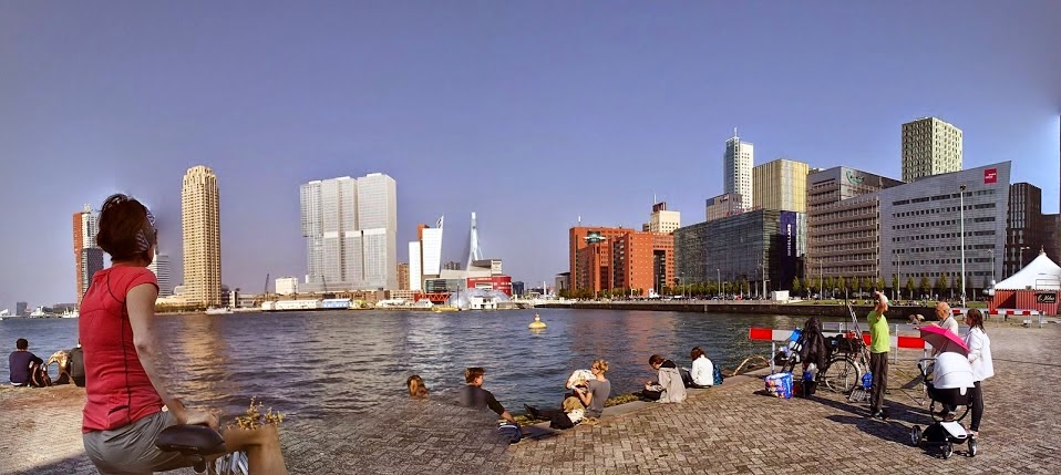 Zwiedzanie Rotterdamu. Oczywiście na rowerach, bo można więcej zobaczyć, zresztą tutaj wszyscy jeżdżą na rowerach. Mieliśmy okazję nauczyć się systemu jeżdżenia w mieście w dużym ruchu. Przypomina to jazdę samochodem, trzeba patrzeć cały czas na oznakowania kto komu ustępuje pierwszeństwa (białe trójkąty na asfalcie) i na sygnalizację świetlną, która jest zupełnie niezależna od tej dla samochodów i dla pieszych. Przy dużych skrzyżowaniach są słupki z przyciskami do włączania zielonego światła (jeśli jest to mała ulica to zapala się dosłownie po 10 sek., tylko przy dużych czeka się nieco dłużej). Na rondach rowerzyści mają swój osobny pas z pierwszeństwem przejazdu względem samochodów. W innych miejscach trzeba ustępować samochodom i nie ma żadnych uprzejmości i przepuszczania rowerzystów.