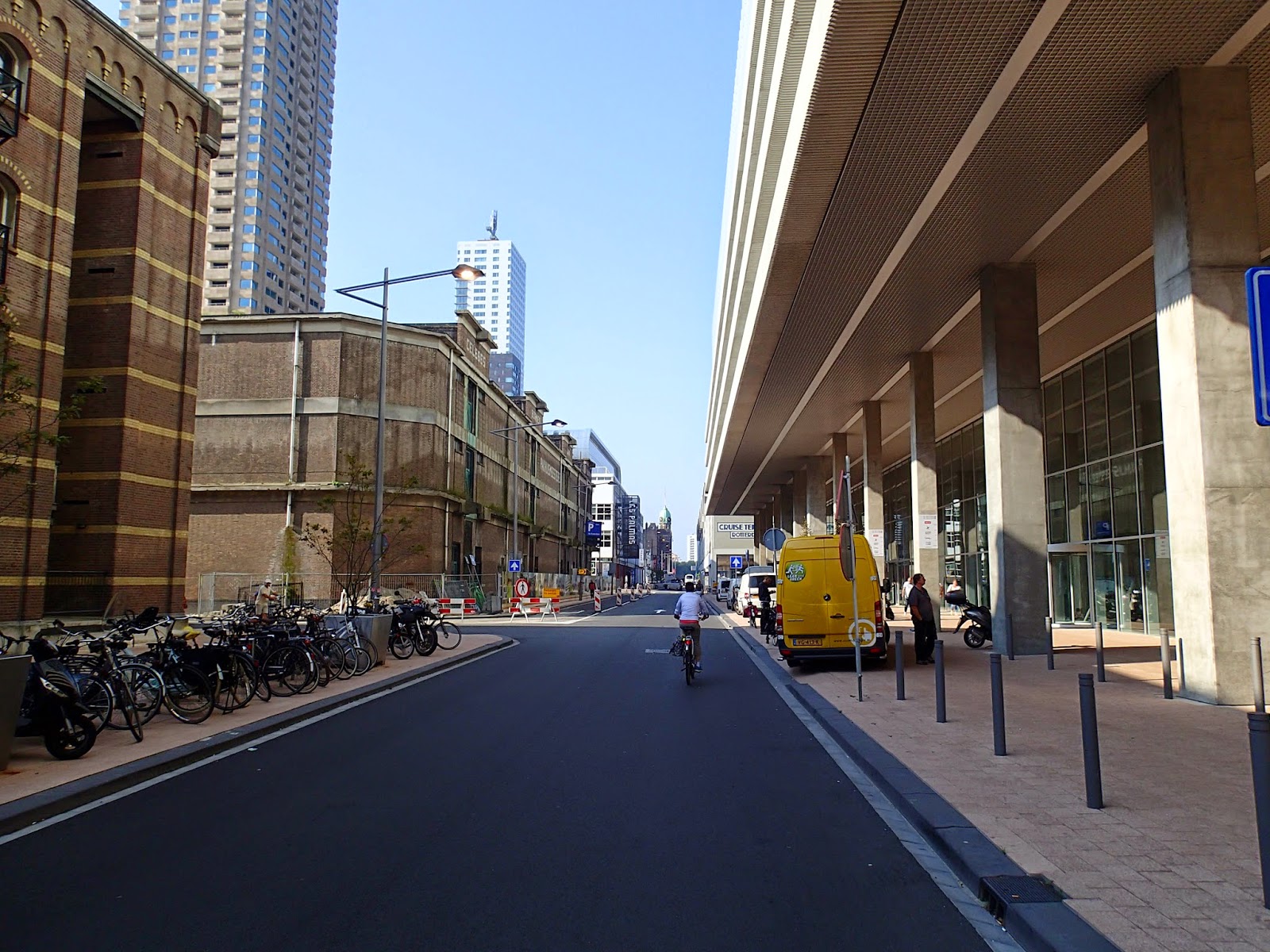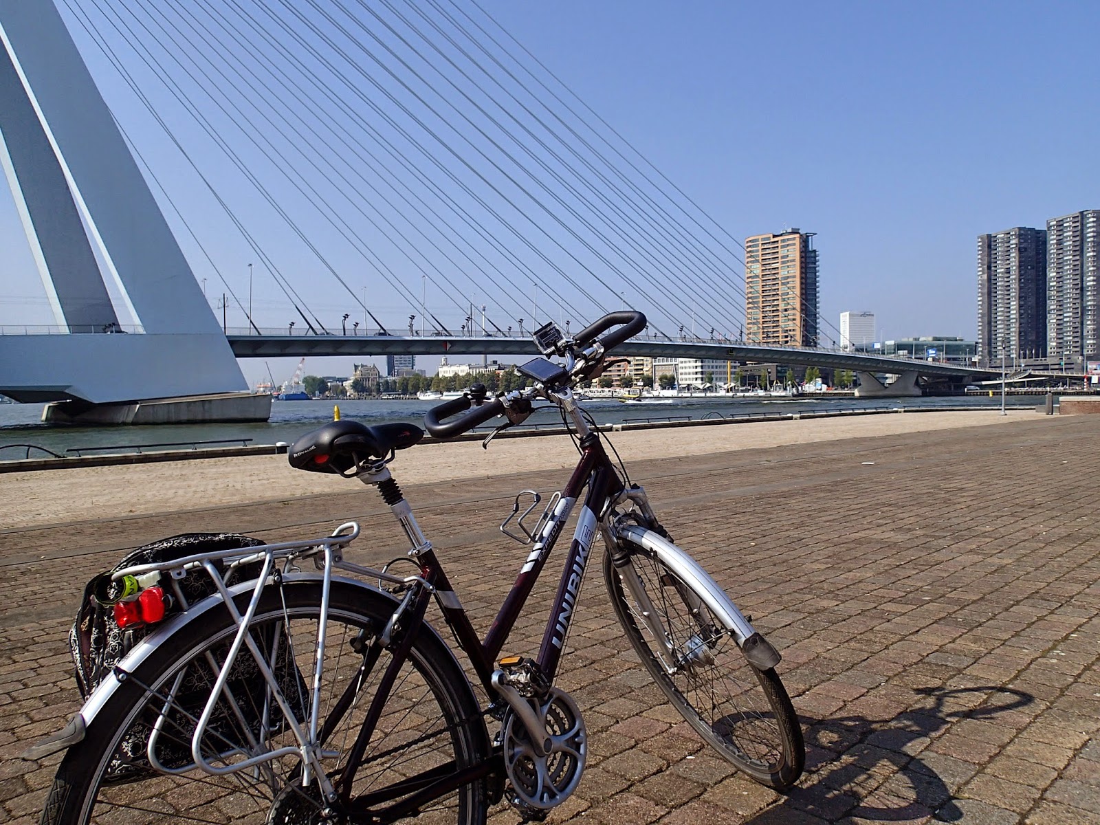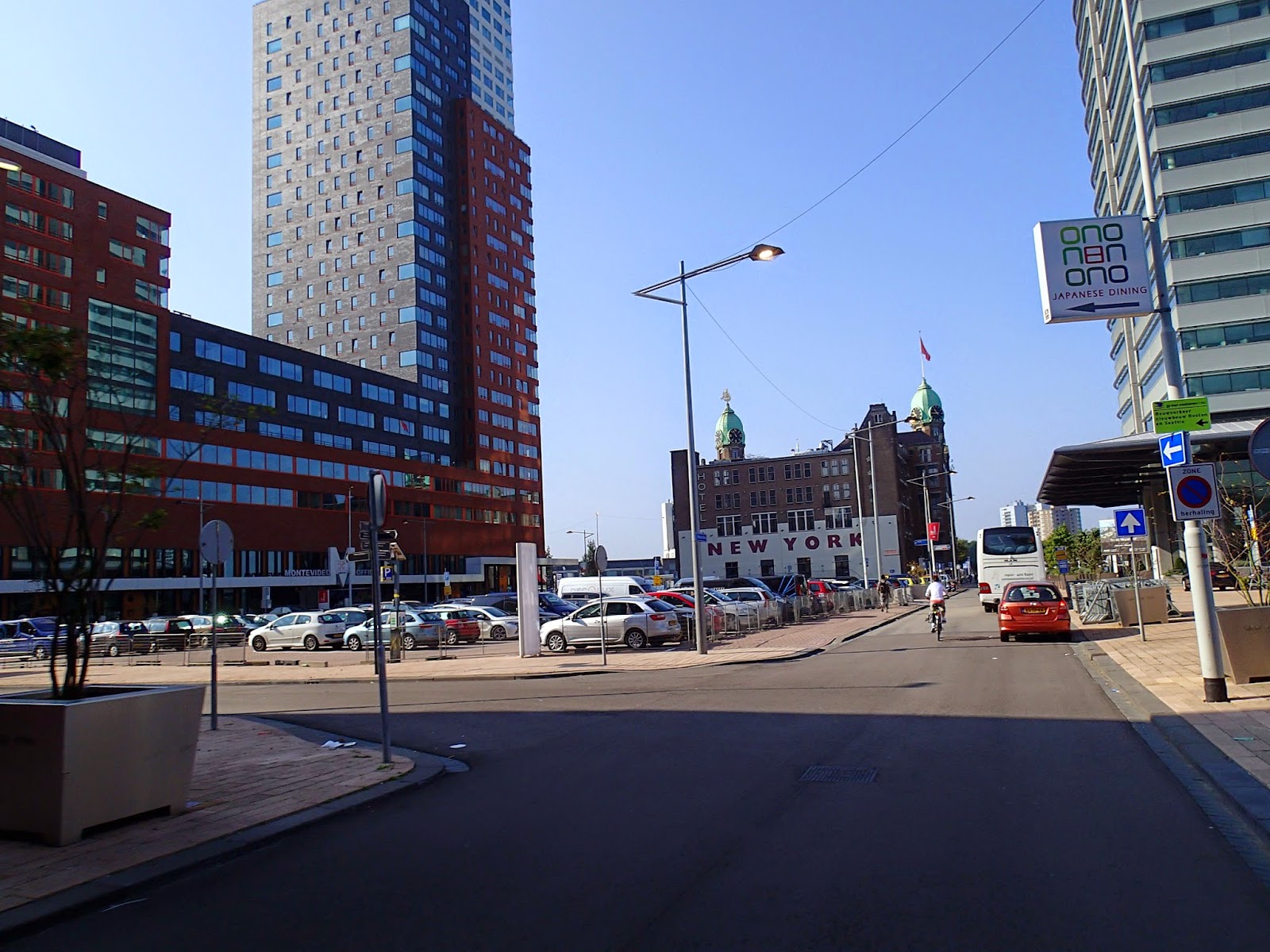 Zwiedzanie Rotterdamu. Oczywiście na rowerach, bo można więcej zobaczyć, zresztą tutaj wszyscy jeżdżą na rowerach. Mieliśmy okazję nauczyć się systemu jeżdżenia w mieście w dużym ruchu. Przypomina to jazdę samochodem, trzeba patrzeć cały czas na oznakowania kto komu ustępuje pierwszeństwa (białe trójkąty na asfalcie) i na sygnalizację świetlną, która jest zupełnie niezależna od tej dla samochodów i dla pieszych. Przy dużych skrzyżowaniach są słupki z przyciskami do włączania zielonego światła (jeśli jest to mała ulica to zapala się dosłownie po 10 sek., tylko przy dużych czeka się nieco dłużej). Na rondach rowerzyści mają swój osobny pas z pierwszeństwem przejazdu względem samochodów. W innych miejscach trzeba ustępować samochodom i nie ma żadnych uprzejmości i przepuszczania rowerzystów.