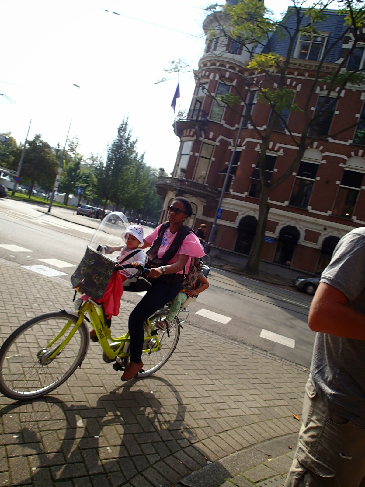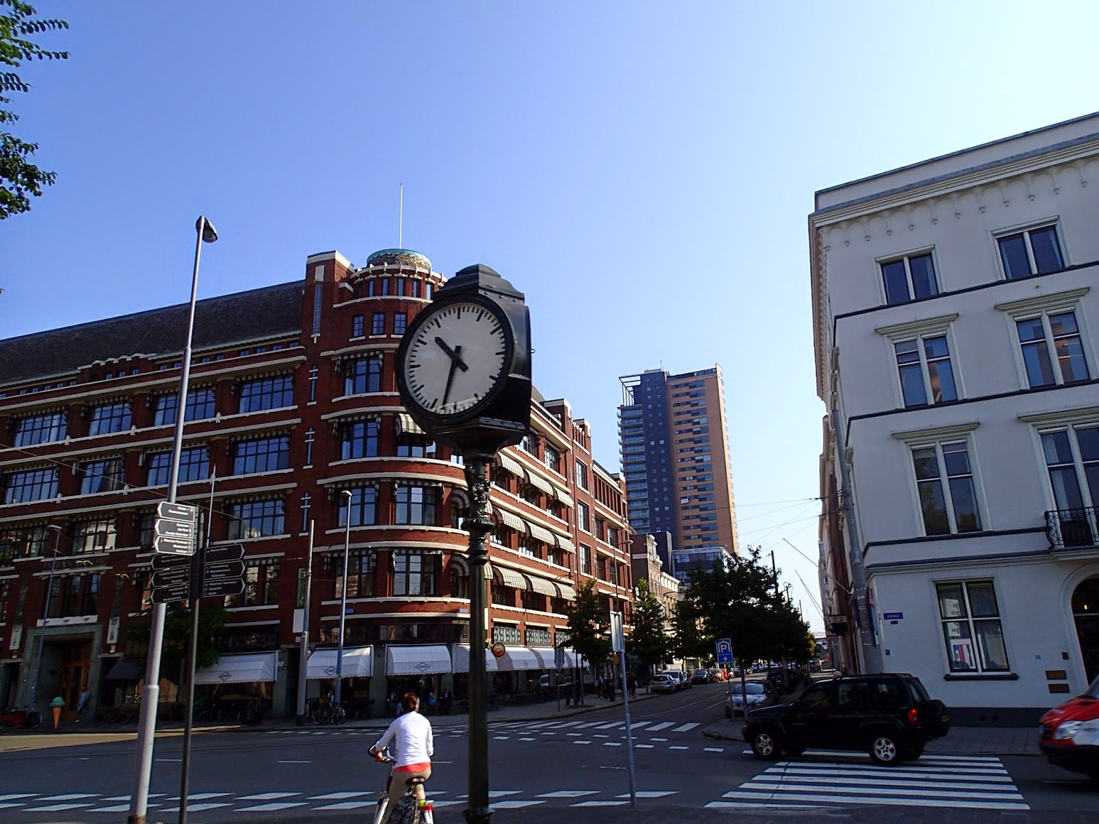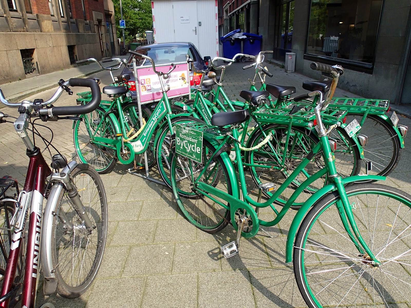 Zwiedzanie Rotterdamu. Oczywiście na rowerach, bo można więcej zobaczyć, zresztą tutaj wszyscy jeżdżą na rowerach. Mieliśmy okazję nauczyć się systemu jeżdżenia w mieście w dużym ruchu. Przypomina to jazdę samochodem, trzeba patrzeć cały czas na oznakowania kto komu ustępuje pierwszeństwa (białe trójkąty na asfalcie) i na sygnalizację świetlną, która jest zupełnie niezależna od tej dla samochodów i dla pieszych. Przy dużych skrzyżowaniach są słupki z przyciskami do włączania zielonego światła (jeśli jest to mała ulica to zapala się dosłownie po 10 sek., tylko przy dużych czeka się nieco dłużej). Na rondach rowerzyści mają swój osobny pas z pierwszeństwem przejazdu względem samochodów. W innych miejscach trzeba ustępować samochodom i nie ma żadnych uprzejmości i przepuszczania rowerzystów.