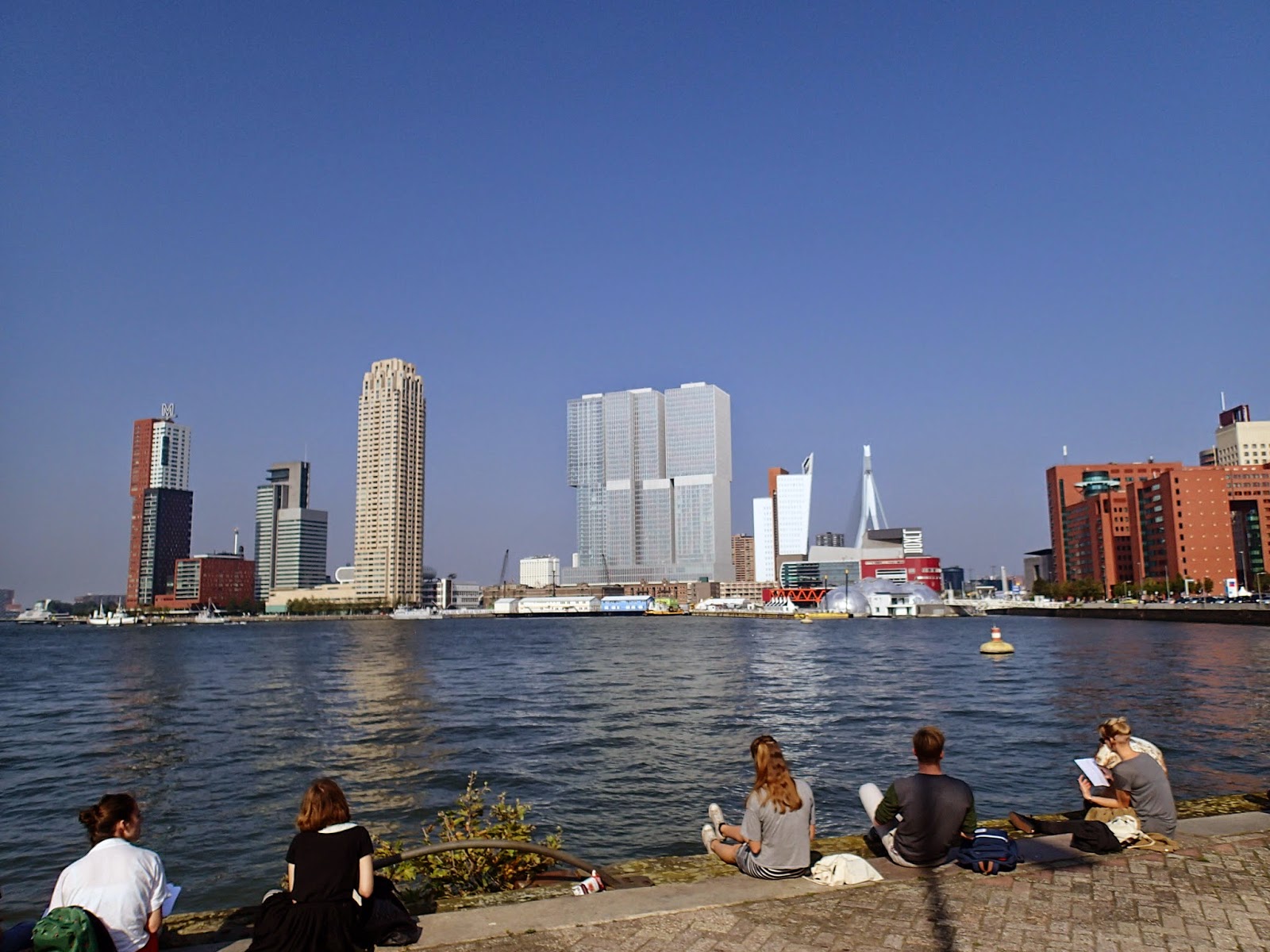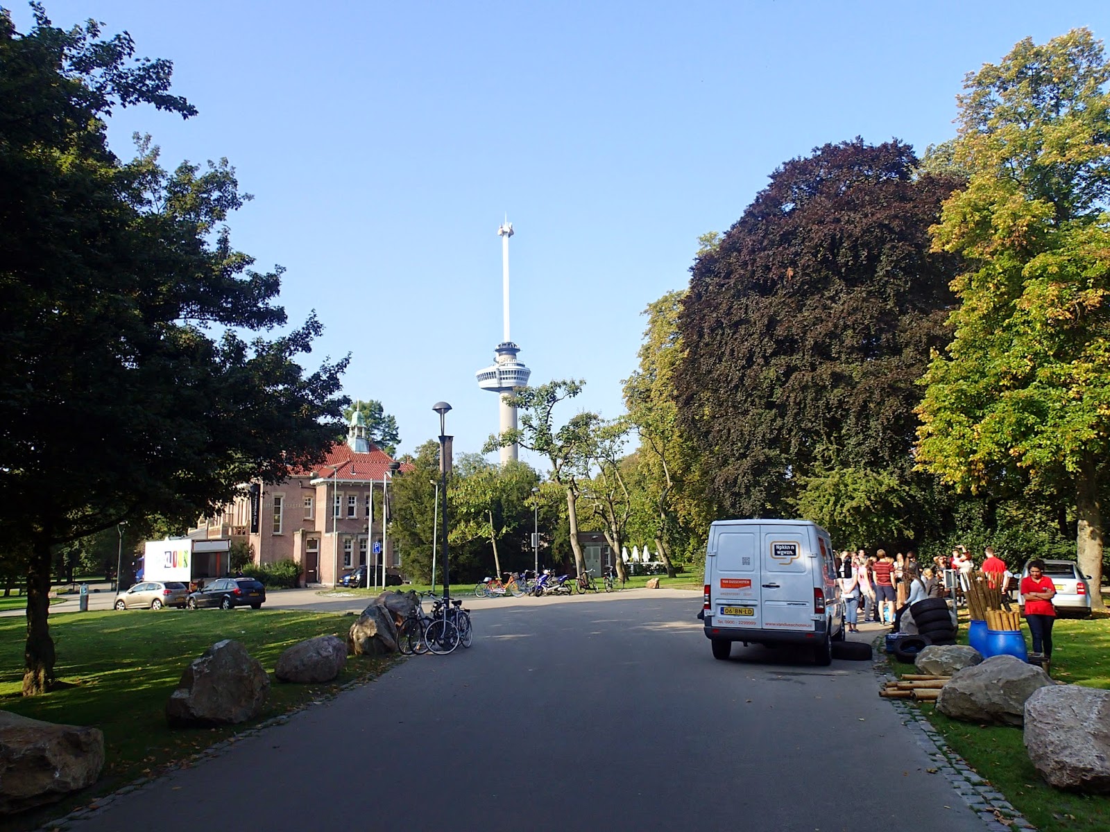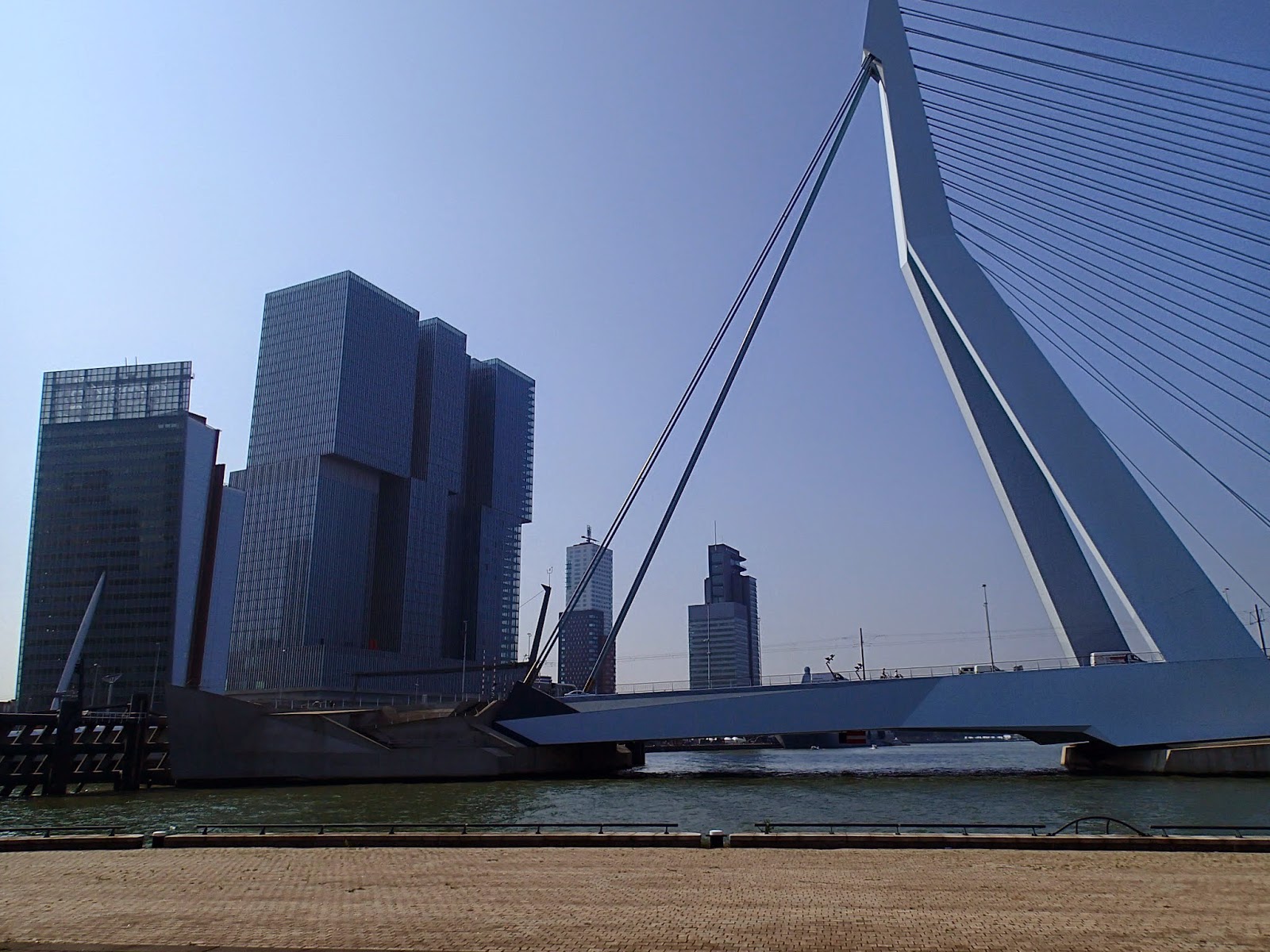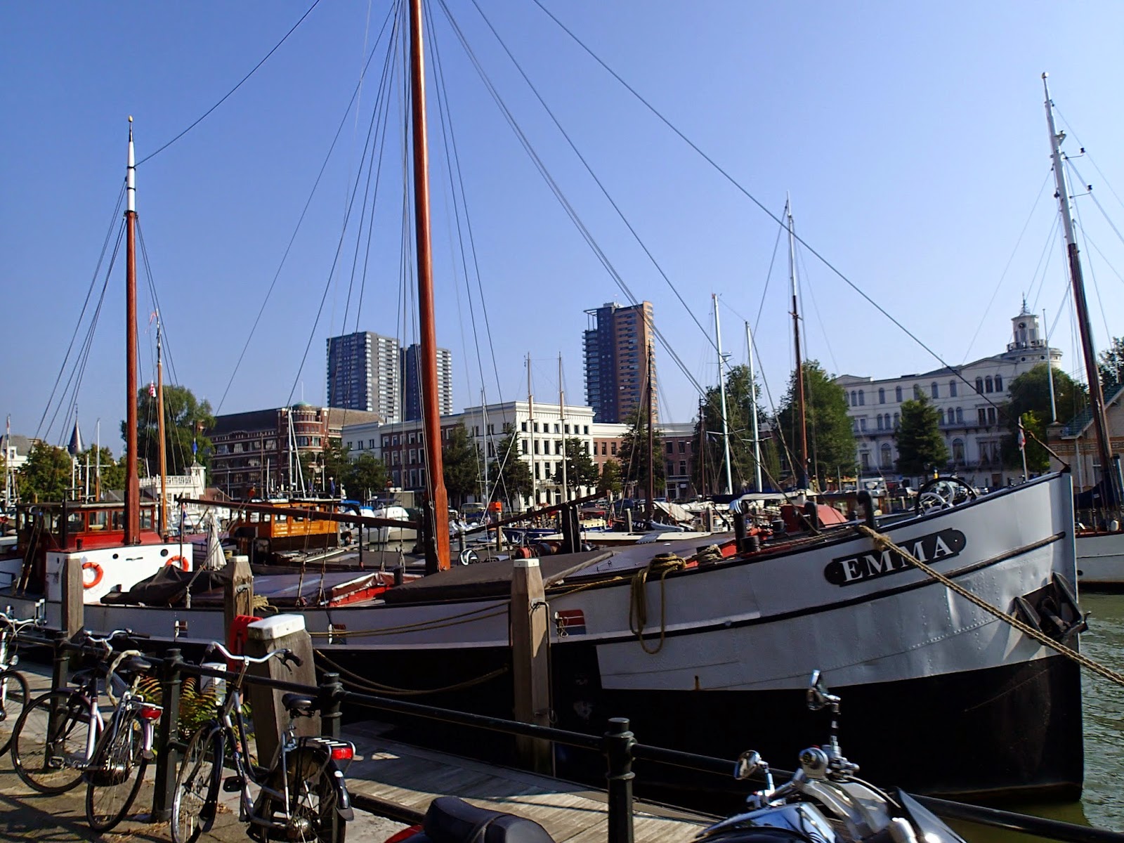 Byliśmy w pobliskim parku obok Euromast (wieży widokowej – najwyższa budowla w Rotterdamie), potem przejechaliśmy dwa najbardziej charakterystyczne mosty, w tym Erasmursburg, będący wizytówką Rotterdamu oraz byliśmy na wyspie. Wyspa jest nieco spokojniejsza, nie ma tam zbyt dużego ruchu i jest to raczej taka część mieszkalna ze starymi kamienicami. Potem odwiedziliśmy stary port, gdzie w przycumowanych barkach mieszkają ludzie, bo widzieliśmy suszące się pranie i powystawiane na pokład stoliki i krzesła.