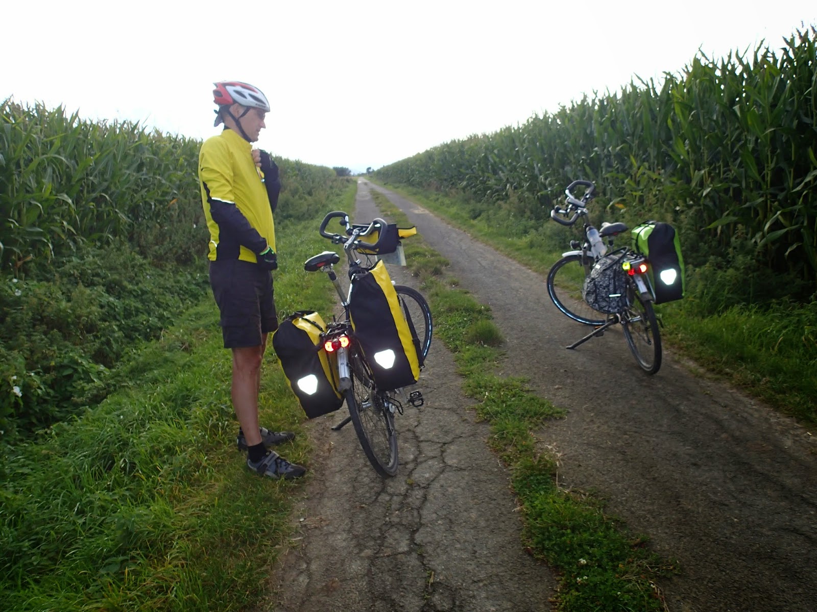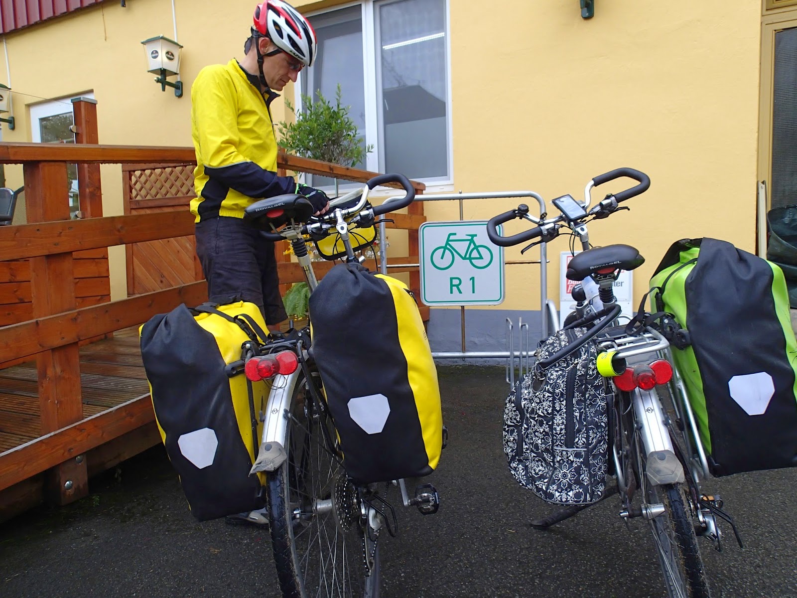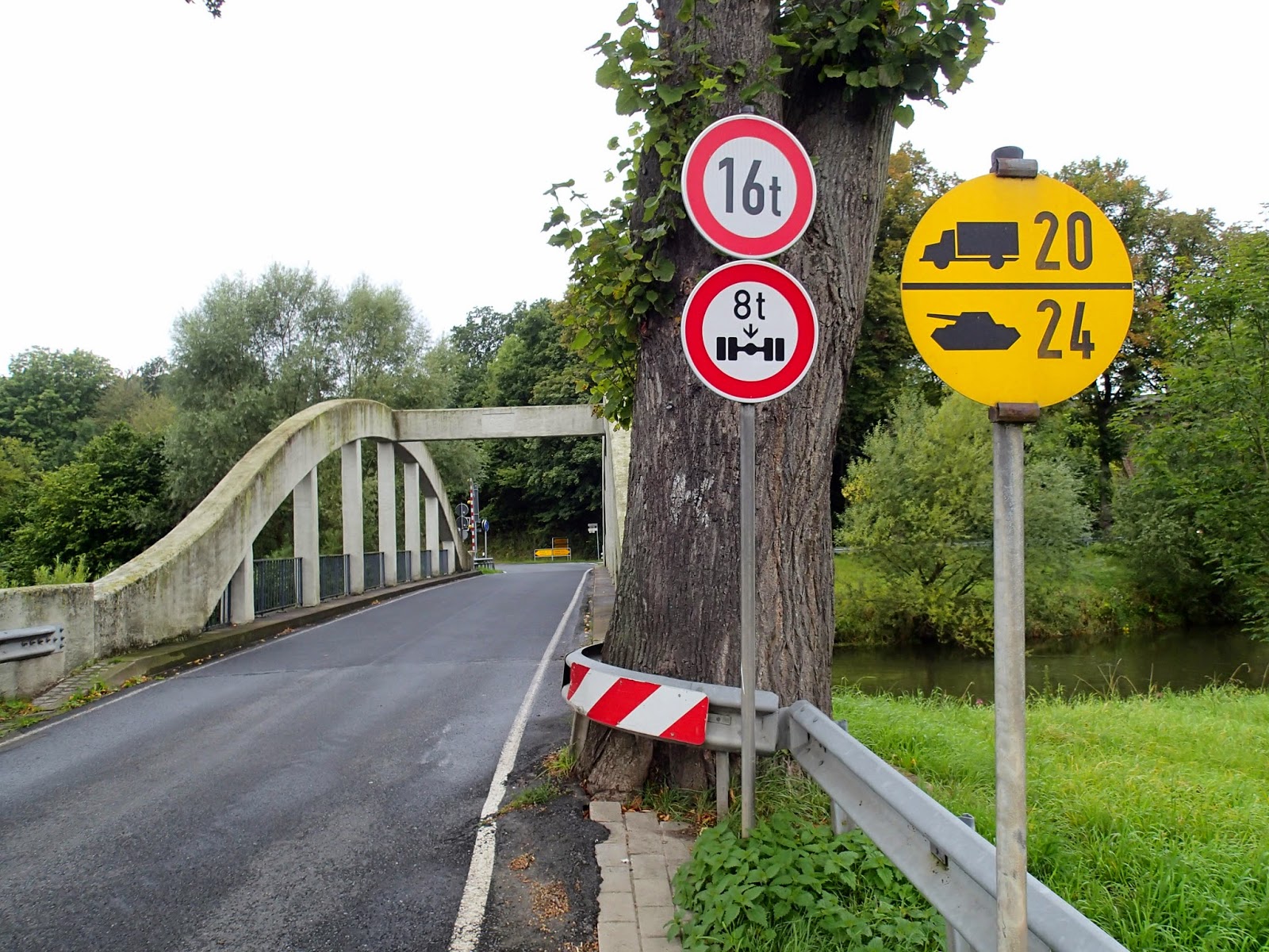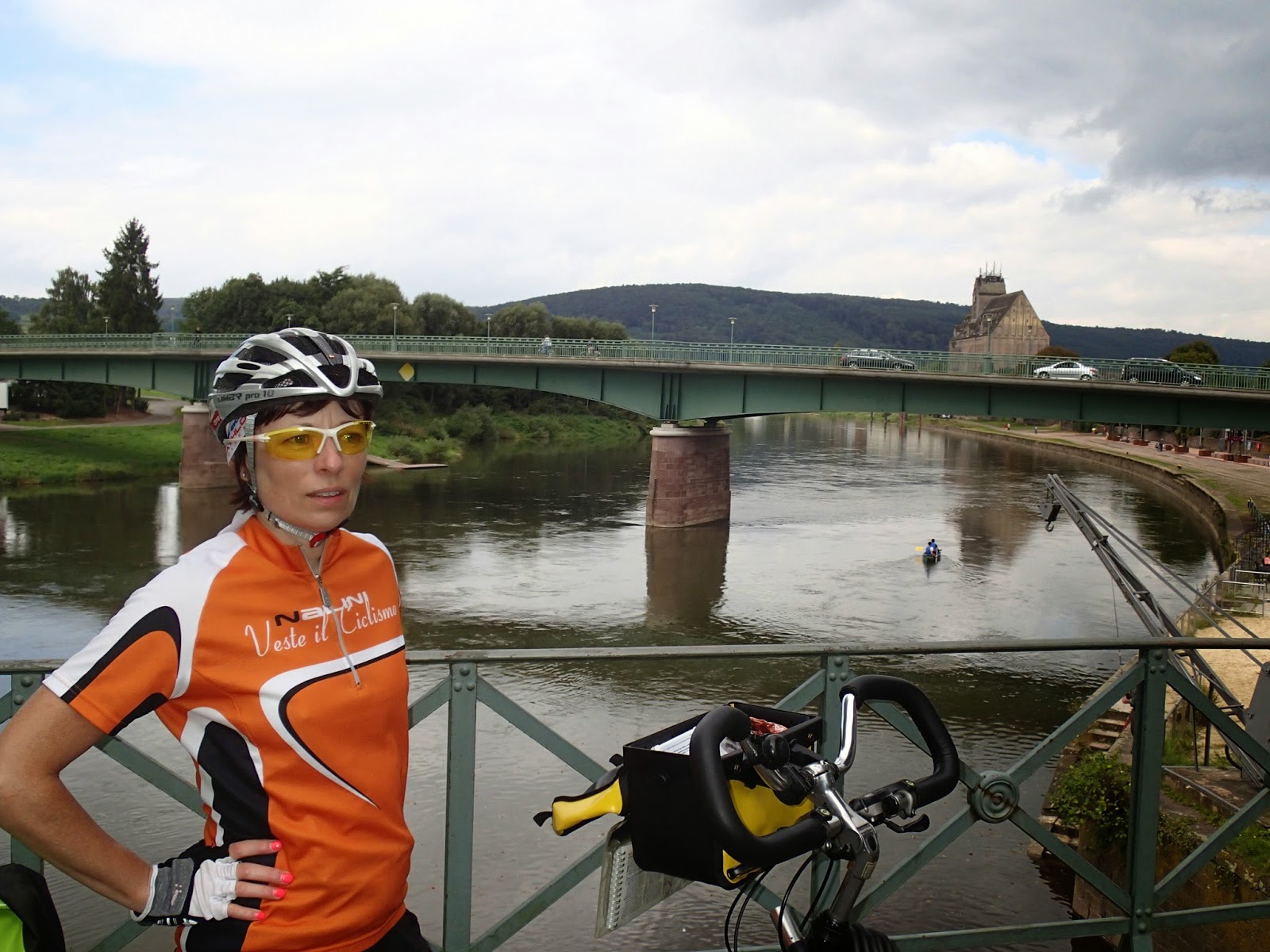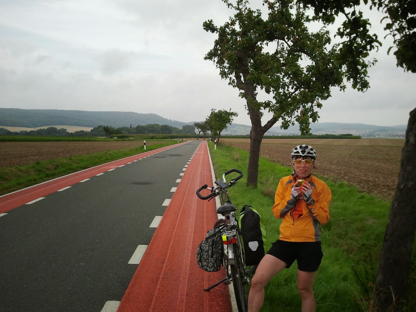 Wyjechaliśmy z pagórkowatych terenów i trasa znów prowadzi łagodniej. Szczególnie płasko było na długim odcinku ścieżki rowerowej nad rzeką. Tam też widzieliśmy najwięcej innych rowerzystów. W Niemczech jest dużo ścieżek rowerowych poprowadzonych wzdłuż rzek, są płaskie i wygodne. Najzabawniej wyglądali starsi kolarze w kolorowych pelerynkach i ochraniaczach na kaski. Tego dnia znów pogoda była w kratkę, często mieliśmy przerwy na zakładanie i zdejmowanie naszych ubrań przeciwdeszczowych. Na szczęście opady były przelotne i co nas zmoczyło to za jakiś czas znów wysuszyło. Najważniejsze, że jechaliśmy ciągle do przodu.