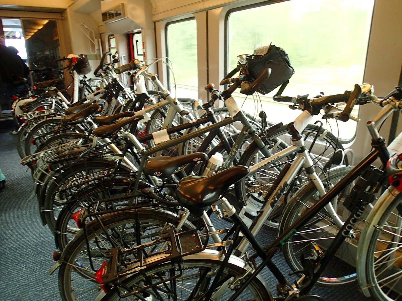 Mamy okazję przećwiczyć jeżdżenie pociągami z rowerami po Niemczech. W pierwszym pociągu było bardzo dużo podróżnych z rowerami, wszystkie wieszaki były zajęte. Wagony wygodne, dużo miejsca. Przesiadka do drugiego niemieckiego pociągu bez żadnych zgrzytów. Na każdym peronie są duże windy, więc nie trzeba nosić rowerów po schodach. Inni rowerzyści pomagają przy wsiadaniu i wysiadaniu z pociągu. Wszystko jest czytelnie oznaczone na biletach, tablicach, dyżurni ruchu kierują do odpowiednich sektorów gdzie zatrzymują się wagony do przewozu rowerów. Obsługa konduktorska miła, informacje o zbliżaniu się do kolejnych stacji po niemiecku i angielsku zrozumiałe i odpowiednio wczesne tak aby podróżni mieli czas się przygotować. Pociągi z bardzo niewielkim opóźnieniem, ale raczej punktualne.