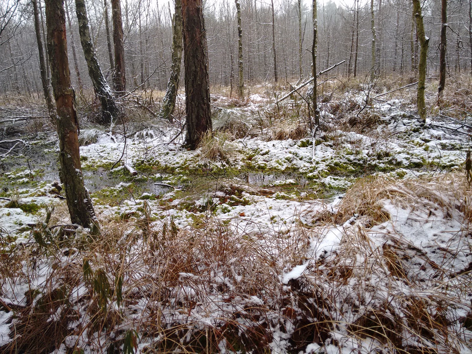 Po drodze minęliśmy kilka podmokłych fragmentów, gdzie przeważa roślinność bagienna. Tam znowu przypomniało mi się jak kiedyś latem nie można było się zatrzymać na zrobienie zdjęcia uroczego jeziorka, z uwagi na chmary komarów. Dziś komarów nie uświadczyliśmy i mogliśmy zatrzymywać się do woli. Ale naszym celem było bieganie, zatem fotek mamy tyle co na palach u jednej ręki, za to kilometrów przemierzyliśmy więcej niż palców u moich obu rąk.