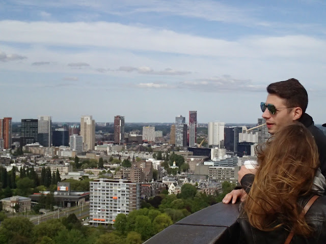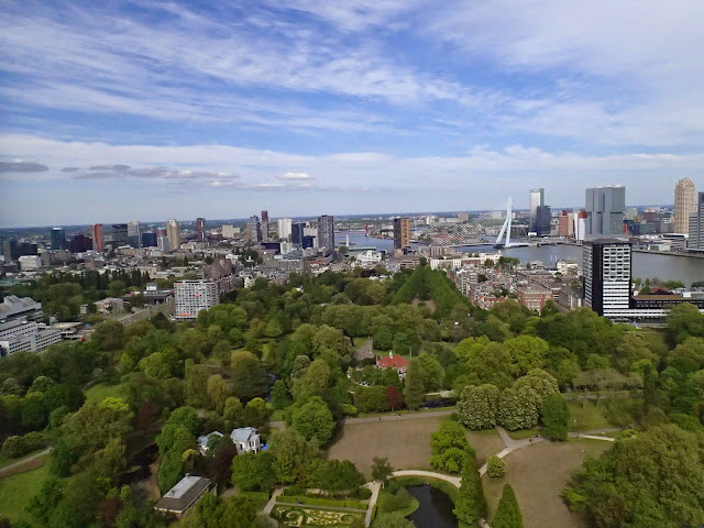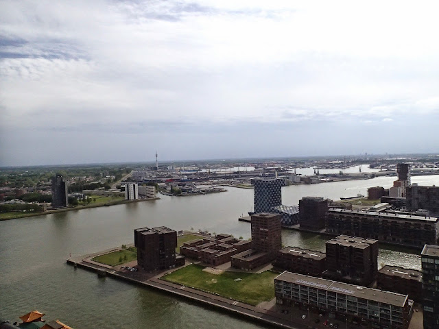 Potem postanowiliśmy obejrzeć miasto z góry co było możliwe dzięki szybkobieżnym windom i tarasowi widokowemu pobliskiej wieży Euromast. Kolejka chętnych była ogromna, ale po śniadaniu nigdzie nam się śpieszyło.Widok na panoramę nie pozostawia złudzeń, że to miasto portowe, choć nie widać całości, bo doki portowe ciągną się po horyzont, na pełne morze wypływa się dopiero za jakieś 40 km stąd.