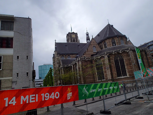 Trasa biegu prowadzi oczywiście obok kościoła, który jako jedyny budynek ocalał z pamiętnego bombardowania Rotterdamu w maju 1940 r. Do dziś widać z daleka jego wieżę, która wygląda jakby nigdy nie została odbudowana.