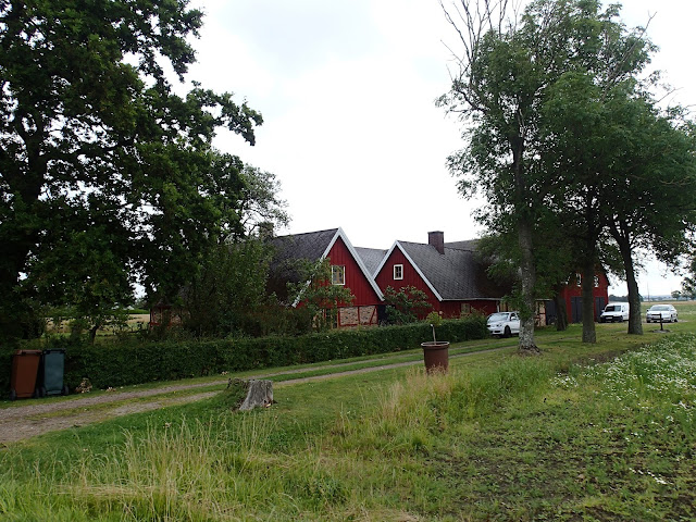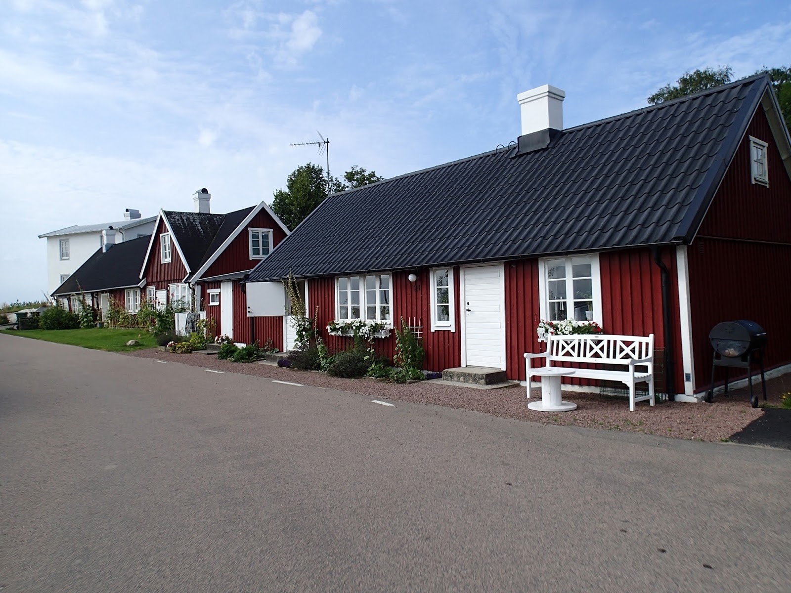 Zaraz na wyjeździe minęła nas kolarka, jechała na szosowym rowerze, była ubrana na krótko. Pozdrowiła Darka, a obok mnie przejechała bardzo szybko, ale tutaj mają dobre asfalty to się śmiga. Zaczęły się szwedzkie flagi przed domkami. Darek powiedział, że tak sobie właśnie wyobrażał Szwecję widząc te domki pomalowane na czerwono.
