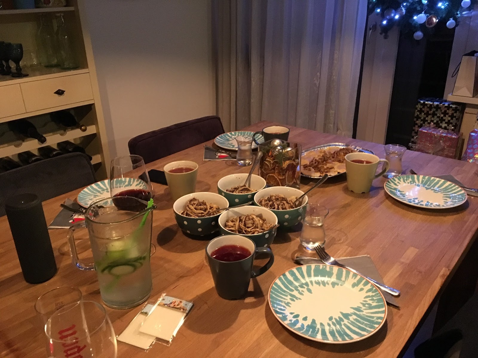 Mieliśmy wszystko co powinno być: Adam ugotował domowy czerwony barszcz, zrobiliśmy pierogi, a na deser przygotowaliśmy kutię, czyli mak z bakaliami i miodem dodaliśmy do ugotowanego makaronu (na namoczenie pszenicy nie było już czasu, a poza tym skąd wziąć ziarno?). Też smakowało wybornie. I zostało jeszcze z każdego dania tyle na następny dzień, że najedliśmy się wspólnie z zaproszonymi gośćmi, czyli rodzicami Angeli i jej bratem z żoną i ich synem.