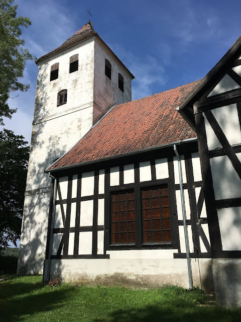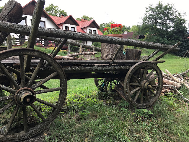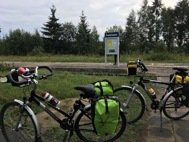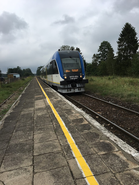 Ostatniego dnia naszych wakacji pogoda załamała się, więc nie było żal wyjeżdżać. Tyle, że nie zrealizowaliśmy zaplanowanej wycieczki rowerami do Olsztyna. Za to wypróbowaliśmy szynobus kursujący na tej trasie, co było dla nas nowością. Nowoczesny, wyglądający jak prosto z fabryki pociąg, kontrastował z miejscem, do którego przyjechał. Była tutaj nowa tylko tablica z nazwą miejscowości i rozkładem jazdy, zaś peron i poczekalnia pochodziły jeszcze z czasów innej epoki kolejowej.