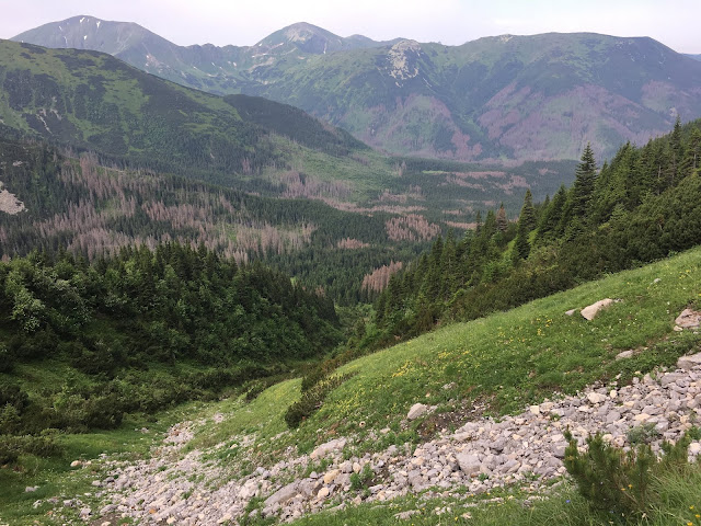Ponieważ nigdy nie pociągała nas speleologia nie szukaliśmy wrażeń w licznych tutaj jaskiniach i minęliśmy bez żalu drogowskaz do wejścia do Jaskini Mylnej. Nie szliśmy też do schroniska Ornak (o tej porze na pewno było zamknięte) tylko skierowaliśmy się dalej zielonymi znakami w kierunku Czerwonych Wierchów.