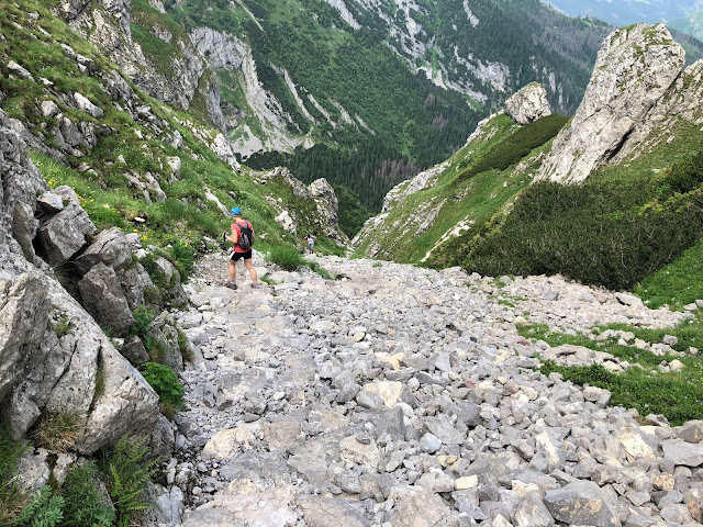 Początkowo zejście jest dosyć łagodnie strome, można iść w miarę szybko. Wkrótce jednak jest coraz bardziej stromo, trzeba uważać gdzie stawia się stopę, a do tego skalne rumowisko kamieni jest coraz bardziej zdradliwe i trzeba pilnować wytartego szlaku. Po drodze jest tez krótki odcinek z łańcuchami. Za skalnym odcinkiem Kobylarzowego Żlebu mijamy jeszcze wchodzących mozolnie na szczyt, choć wyraźnie w powietrzu czuć już przedsmak zapowiadanej na dziś po południu burzy. Powietrze jest nagrzane, parne i zaczyna się chmurzyć. Czyli to jednak prawda, że ludzie w góry wychodzą późno i nie sprawdzają prognoz pogody. Nie wyobrażam sobie schodzenia tą trasą po mokrych i śliskich kamieniach.