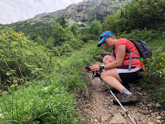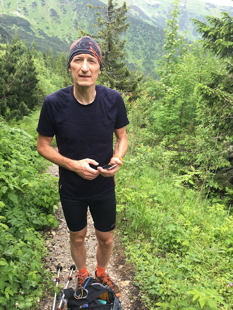 Dużo mniej ciekawie jest w niższej części szlaku. W lesie bowiem nie wszędzie wyschło po wczorajszej popołudniowej ulewie. Chwila nieuwagi, czy niefortunnie postawionej stopy i dwa razy z poślizgiem zaliczam glebę. To, że mam ubłocone spodenki to bajka, ale przy drugim upadku coś mi chrupnęło dziwnie w kostce. W pierwszej chwili boję się wstać, ale z pomocą Darka udaje mi się wrócić do pozycji pionowej. Ostrożnie stawiam lewą stopę. Coś tam boli, ale nie na tyle aby nie można było dalej iść.