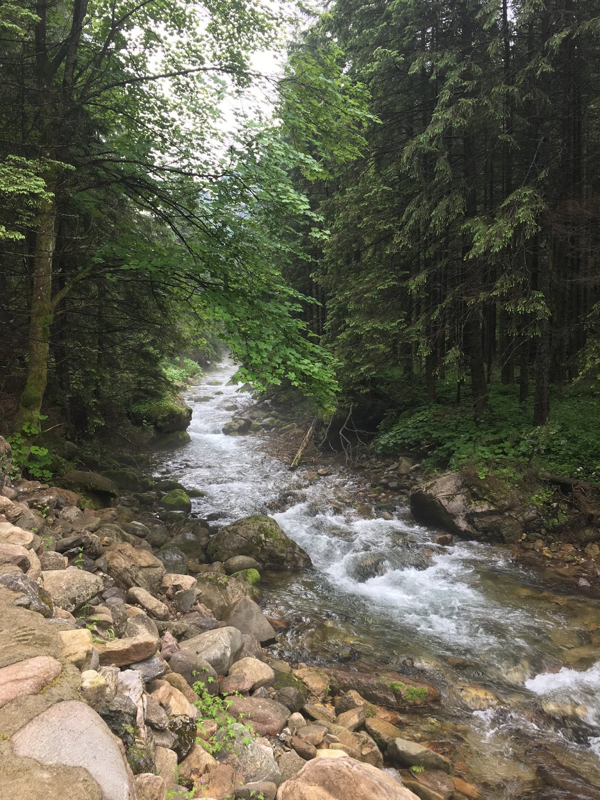 Na początek wycieczka w góry średniej długości w skali zaplanowanych na ten wyjazd. Start w Kirach na długo przed otwarciem punktu kasowego przy wejściu do Tatrzańskiego Parku Narodowego. W Dolinie Kościeliskiej przywitała nas lekka poranna mgiełka i towarzyszył nam jedynie szum potoku. Zwykle ten płaski i przystosowany dla niepełnosprawnych oraz przeznaczony do spacerów rodzinnych odcinek przemierzają całe tłumy ludzi. Jednak o tak wczesnej porze, poza nami nie było nikogo, nie licząc dwóch dziadków z dorosłymi wnuczkami, którzy przemieszczali się dość niespiesznie. Dlatego przetruchtaliśmy i przemaszerowaliśmy ten początek trasy bez zbytniego marudzenia po drodze.