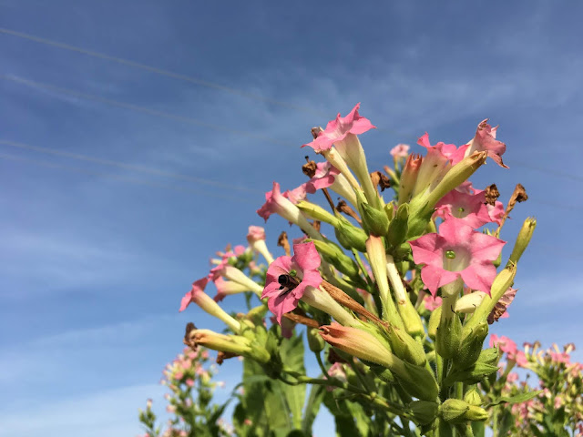 Obok pole z ziemniakami zbieranymi przez trzy młode dziewczyny, które przyjechały z koszami na skuterach. Po drugiej stronie kwitnący jeszcze tytoń.