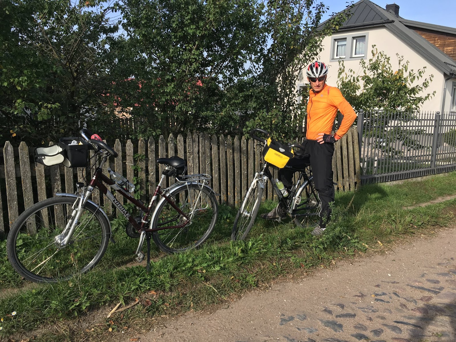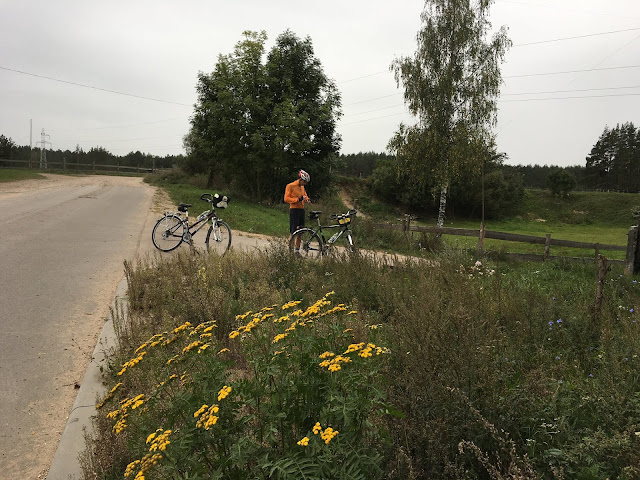 W kolejnej wsi zagaduje nas pan, który pyta czy ciężko tak jechać na tych rowerach. Zatrzymujemy się i zaczynamy rozmowę. Pan usiłuje zrobić na nas wrażenie opowiadając historię swojego kuzyna, który przyjeżdżał do niego na rowerze z Ełku w dwie godziny. To dopiero był kozak.