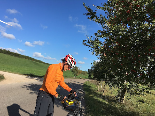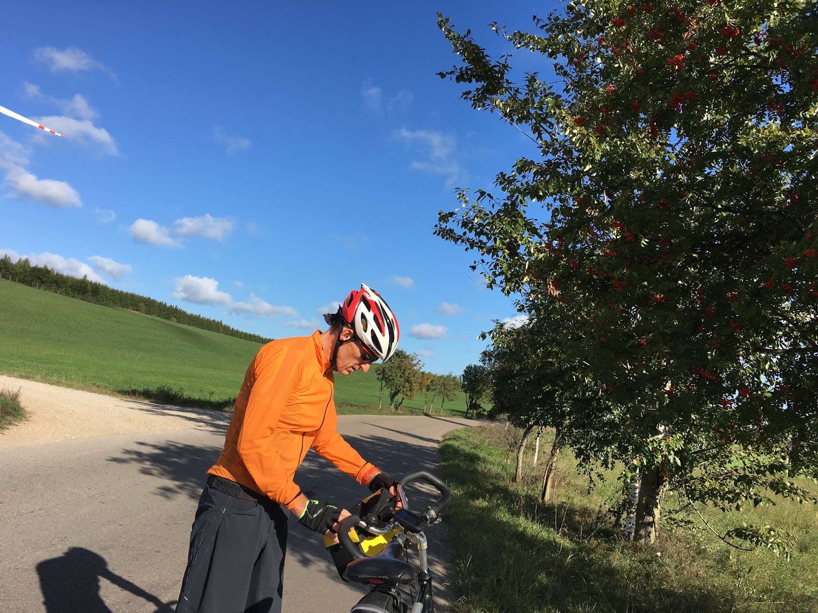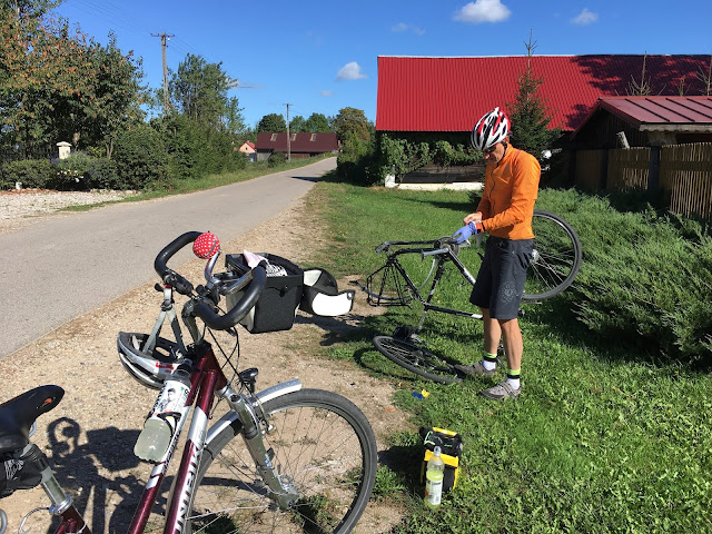 Po serii podjazdów i zjazdów w pofałdowanym terenie, chwila wytchnienia podczas przymusowego postoju na naprawę koła. Dziury w oponie, ani dętce nie udało się nam zlokalizować, ale powietrze uciekało, zatem wymiana dętki na nową była jedyną słuszną opcją.