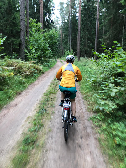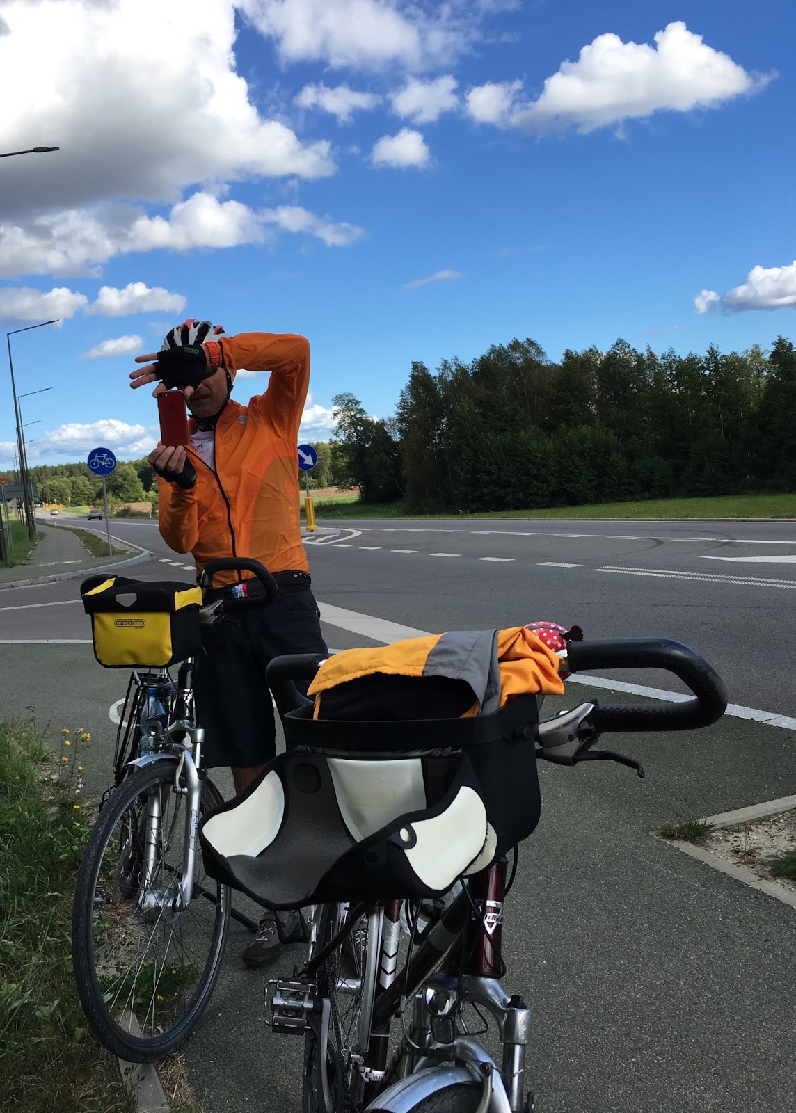 W Sejnach zjechaliśmy na ścieżkę rowerową biegnąca równolegle do drogi. Ścieżka nie skończyła się wcale za wsią, ani nawet za kolejną wsią. Darek zastanawiał się głośno kiedy ta droga dla rowerów się skończy. Wtedy zażartowałam, że pewnie dopiero w Suwałkach. I tak było rzeczywiście. Czekała nas 30 kilometrowa droga dla rowerów. To był najnudniejszy odcinek całej dzisiejszej trasy. Wierzcie lub nie, ale takie „bezpieczne” drogi wcale nie są fajne, zwłaszcza jak biegną tuż obok drogi dla aut. Nie dość, że trasa wcale nie jest malownicza to na dodatek szum samochodów nie pozwala wsłuchać się w przyrodę tak jak wtedy gdy jedzie się przez pola czy las. Tutaj trzeba uważać na znaki drogowe, pilnować czy ścieżka nie zmienia strony i w porę przejechać na drugą stronę szosy w oznaczonym miejscu (często oznaczona słabo i nieintuicyjnie lub wcale, ale to „polski standard” budowania DDR).