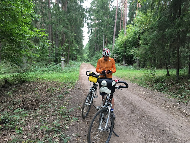 Chwila wytchnienia w lesie. Piach po ośki, więc trzeba rower prowadzić, jechać się nie da.