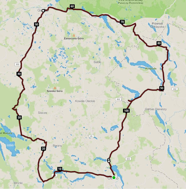 Start i meta w Olecku. Pętla na północy ociera się o Puszczę Romincką. Po drodze liczne jeziora i stare drogi z drzewami po obu stronach. Typowo mazurskie widoki.