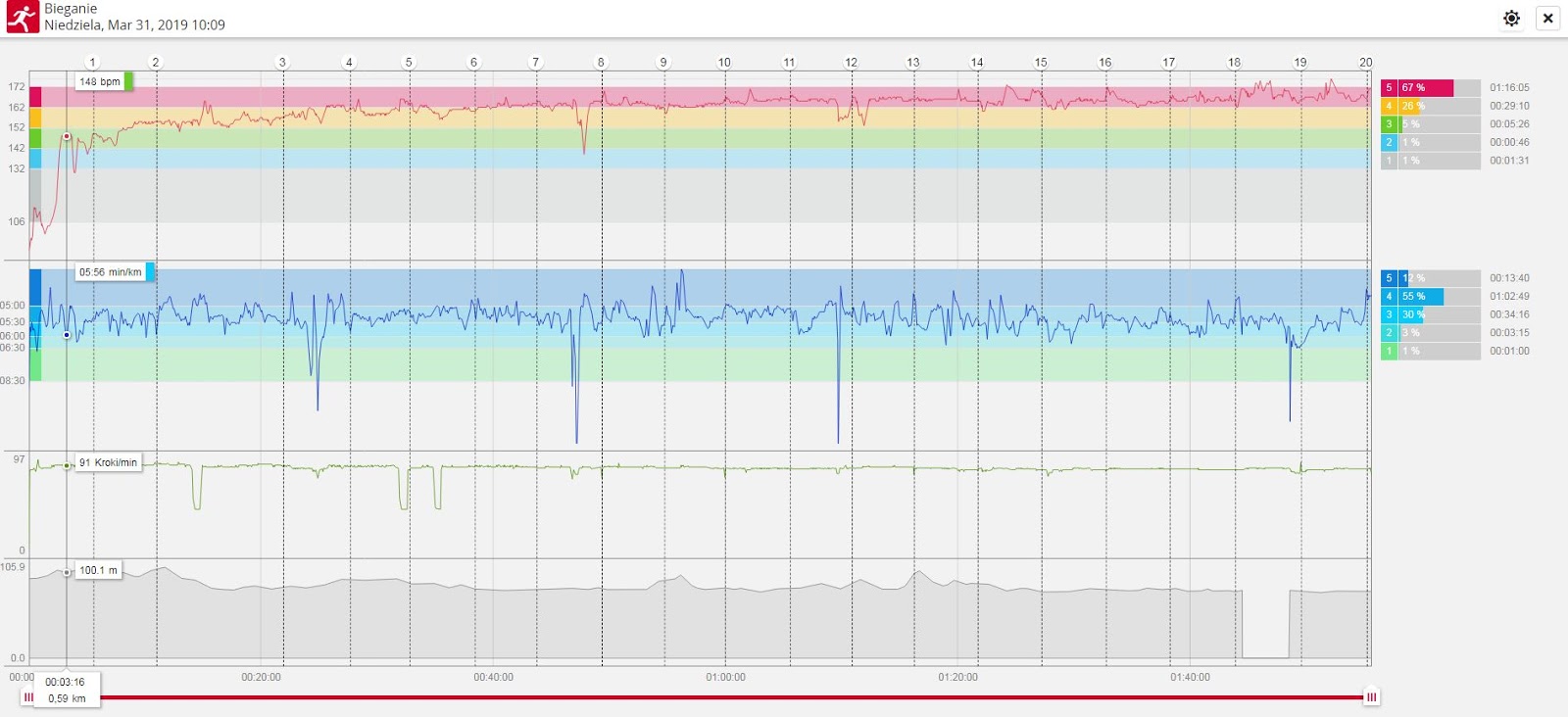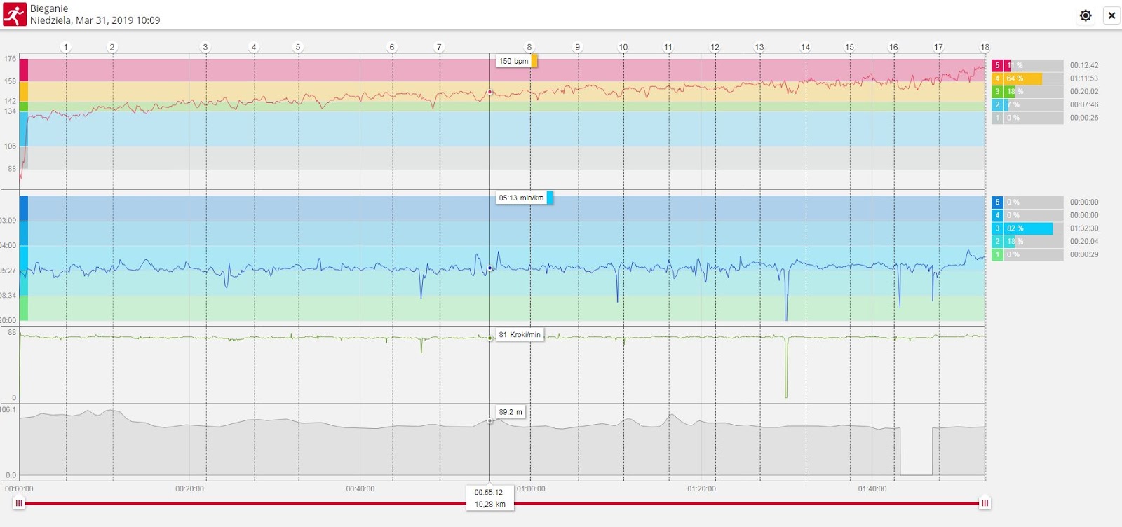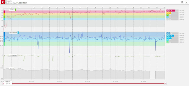 Jeśli zatem patrzeć na nasze czasy (te wybiegane przez nas i wzmocnione treningami) z perspektywy czasu (tego upływającego od naszych narodzin) to plan minimum wykonany z dużą nawiązką. Szczególnie dużą rezerwę widać u Darka, który pomimo czasu straconego na zagubienie się na trasie i próby odnalezienia Renaty, ukończył 14. PMW z bardzo dobrym wynikiem i bez wychodzenia ze strefy swojego komfortu. Bardzo wyraźnie pokazał to jego wykres tętna z zegarka biegowego:
