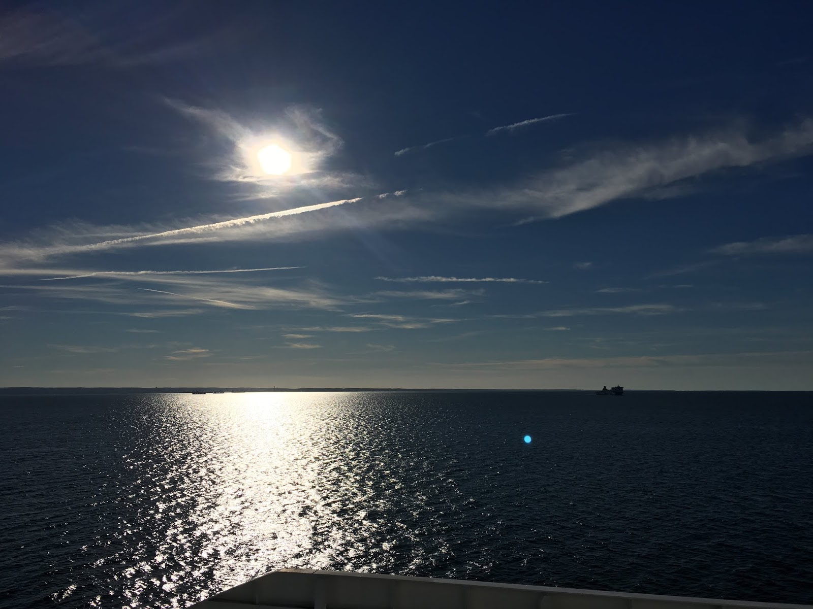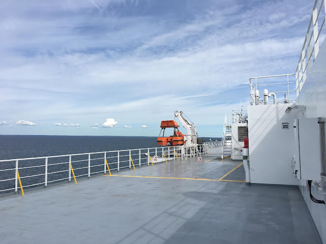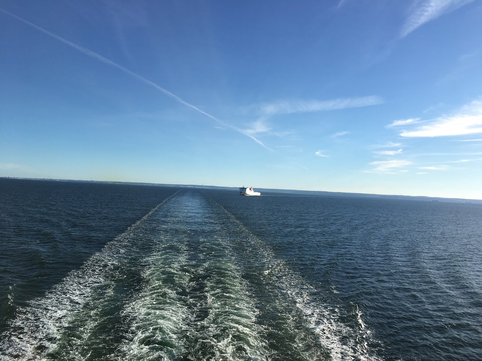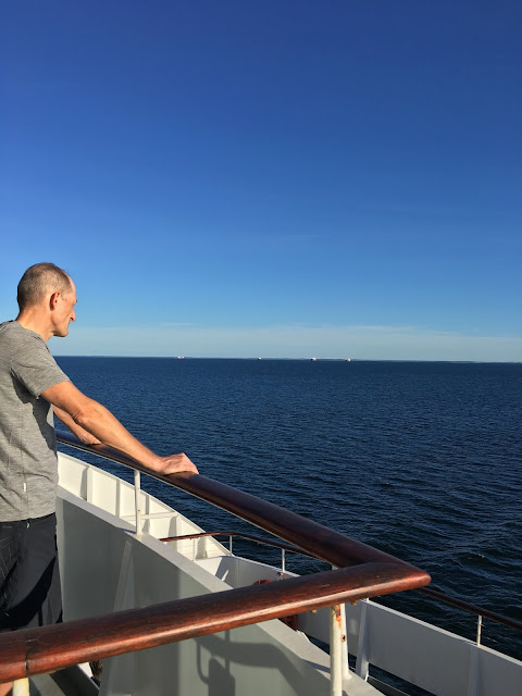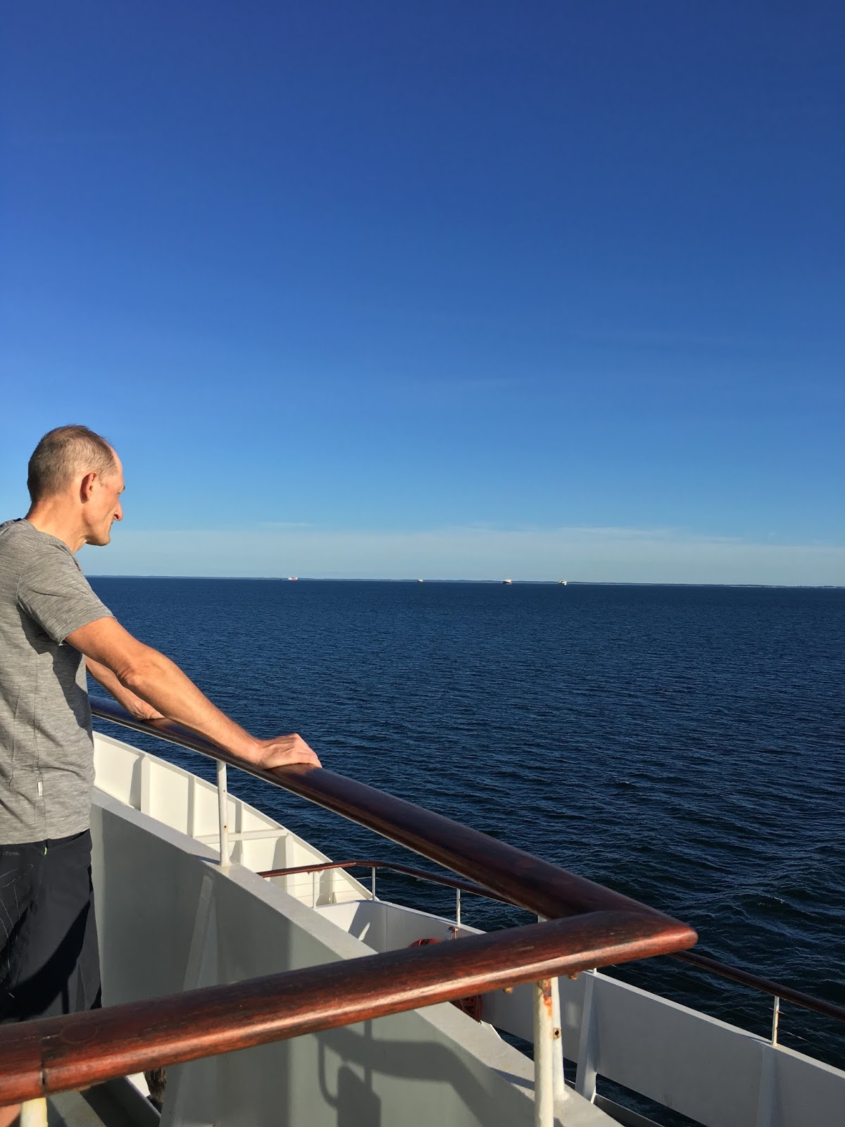 Bałtyk jest spokojny, prom sunie statecznie bez bujania, więc jakoś wytrwamy do rana ciesząc się dobrą pogodą i wolno płynącym czasem.