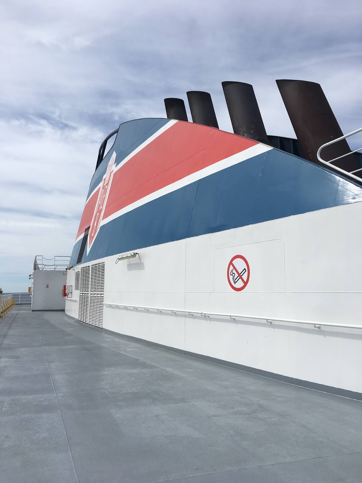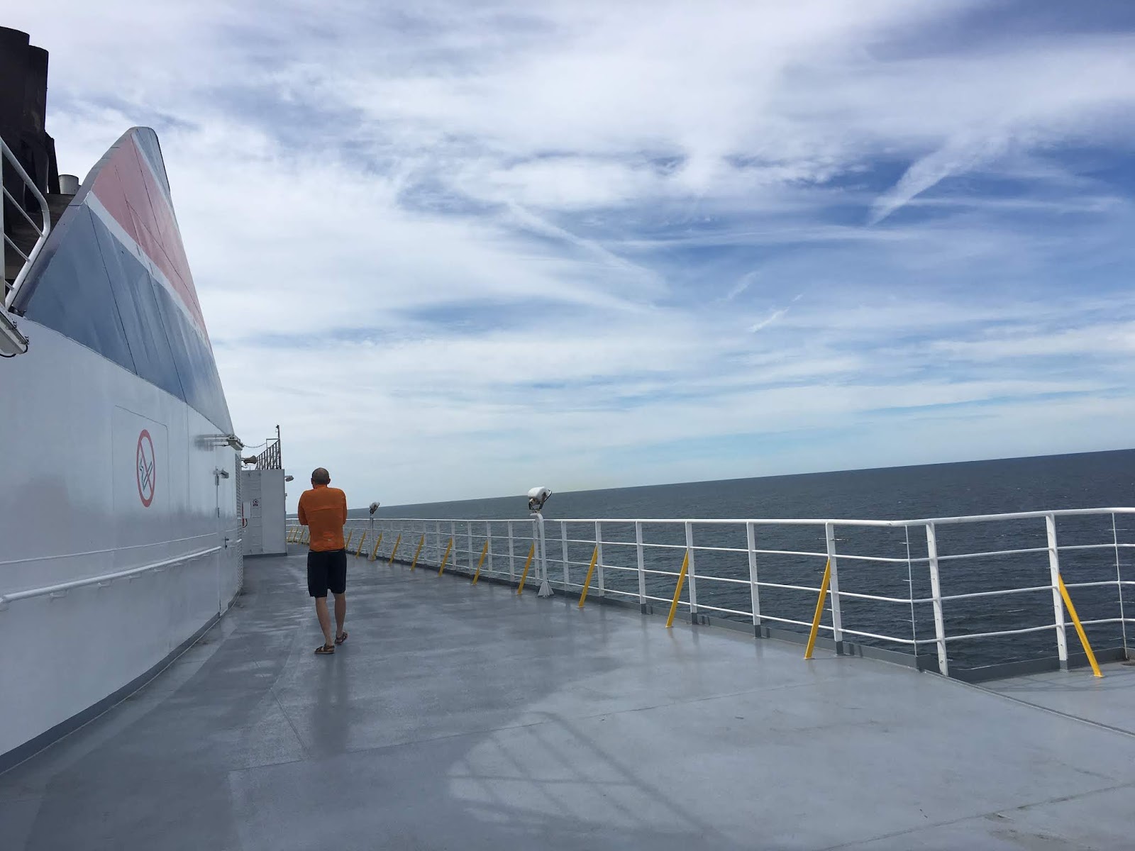 Po minięciu główek portu nie bardzo wiadomo co ze sobą zrobić. Czeka nas całonocna podróż, więc albo kupujemy w promocyjnej cenie grillowe danie i popijamy piwem, jak zachęca stewardesa, albo łazimy bez sensu w kółko po prawie pustym promie.