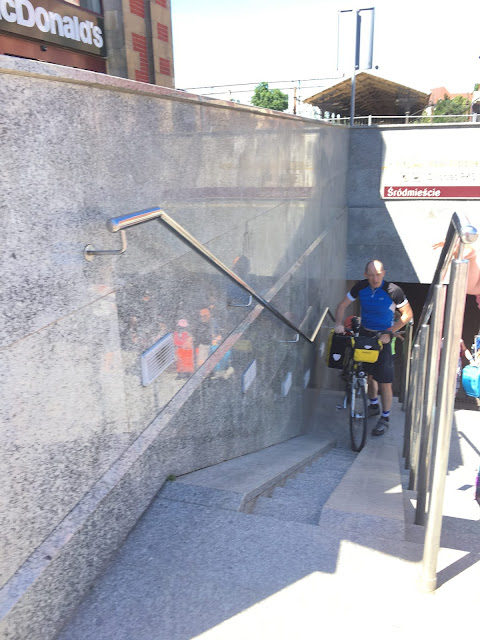 Wreszcie jakoś udaje się, ale potem jeszcze trzeba pokonać kolejne schody w Gdańsku. Darek próbuje wykorzystać ułatwienie dla wózków dziecięcych żeby nie targać znów rowerów, ale to zadanie dość karkołomne. Balansując na wąskich schodkach miedzy marmurową ścianą a stalową barierką udaje mu się ostatecznie wciągnąć rowery na powierzchnię. Nawet znaleźli się chętni do pomocy przechodnie. Miło z ich strony, ale to chyba nie o to chodzi. Miasto Gdańsk tutaj się jednak nie popisało. Cztery lata temu gdy wracaliśmy ze Szwecji też nie było podjazdu dla rowerów. Omijajcie Gdańsk Główny, na którym trwa jeszcze dodatkowo remont i przebudowa przejścia podziemnego na perony.