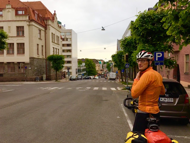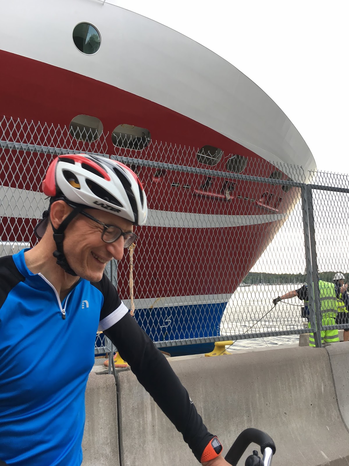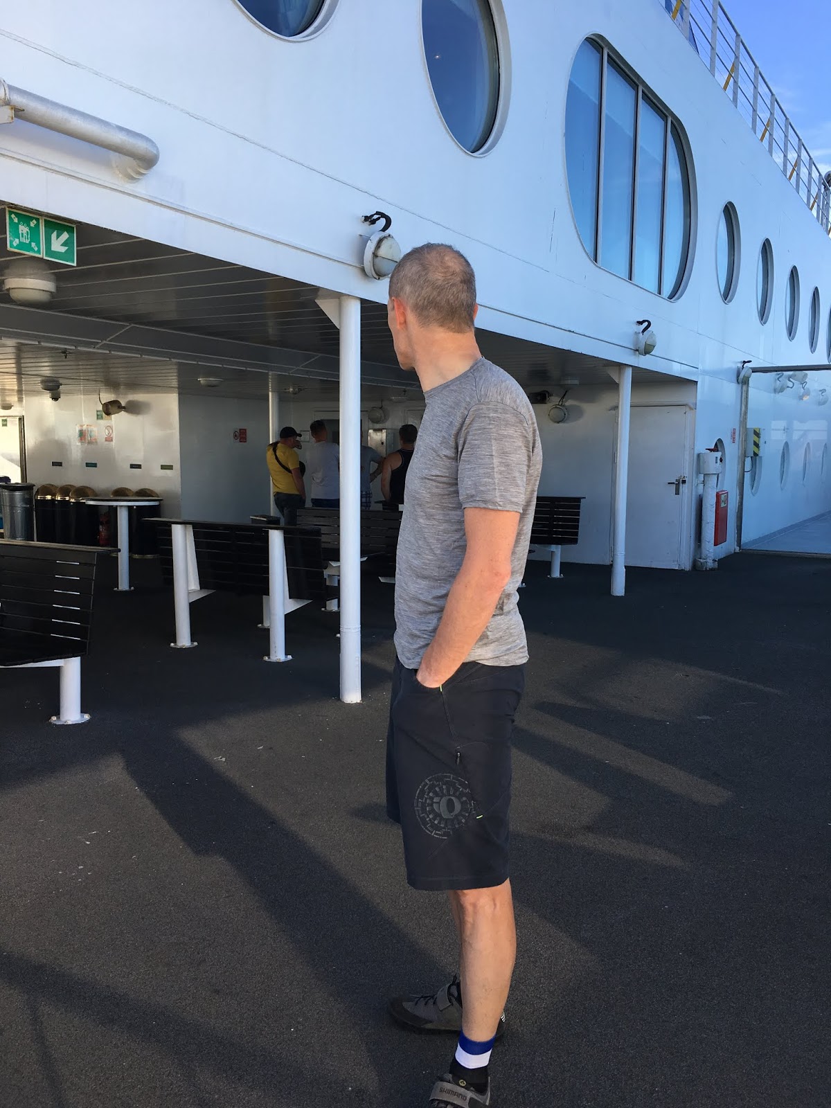 Prom już przybił, ale długo czekaliśmy na wjazd bo dopiero trwał załadunek ciężarówek. Oczekiwanie umilił nam rozmową jeszcze jeden rowerzysta, który okazał się Austriakiem podróżujący do Finlandii na spotkanie ze znajomym Finem. Gadatliwy starszy pan okazał się vice-prezesem wiedeńskiego stowarzyszenia muzycznego o dość bogatym życiu podróżniczym. Aktualnie był w trakcie wyprawy po Europie.